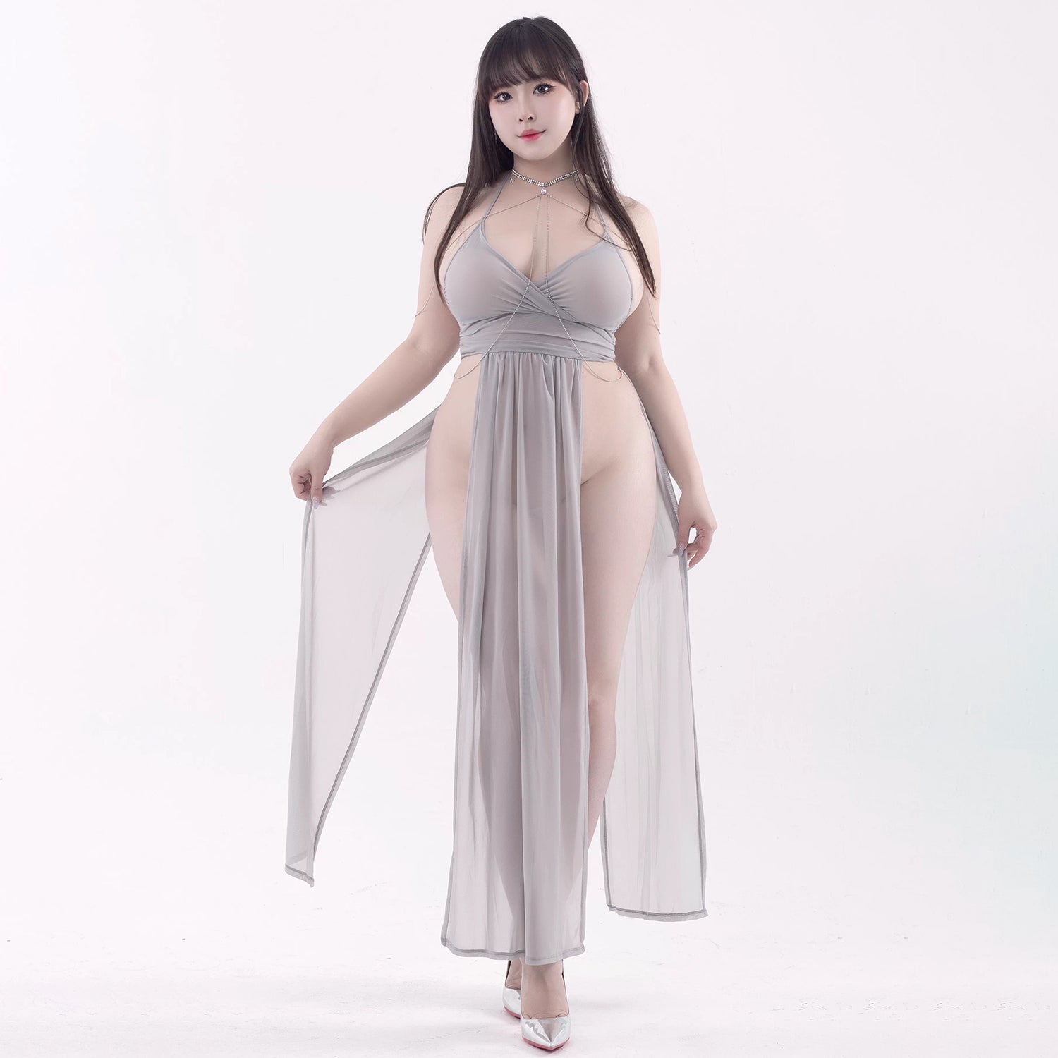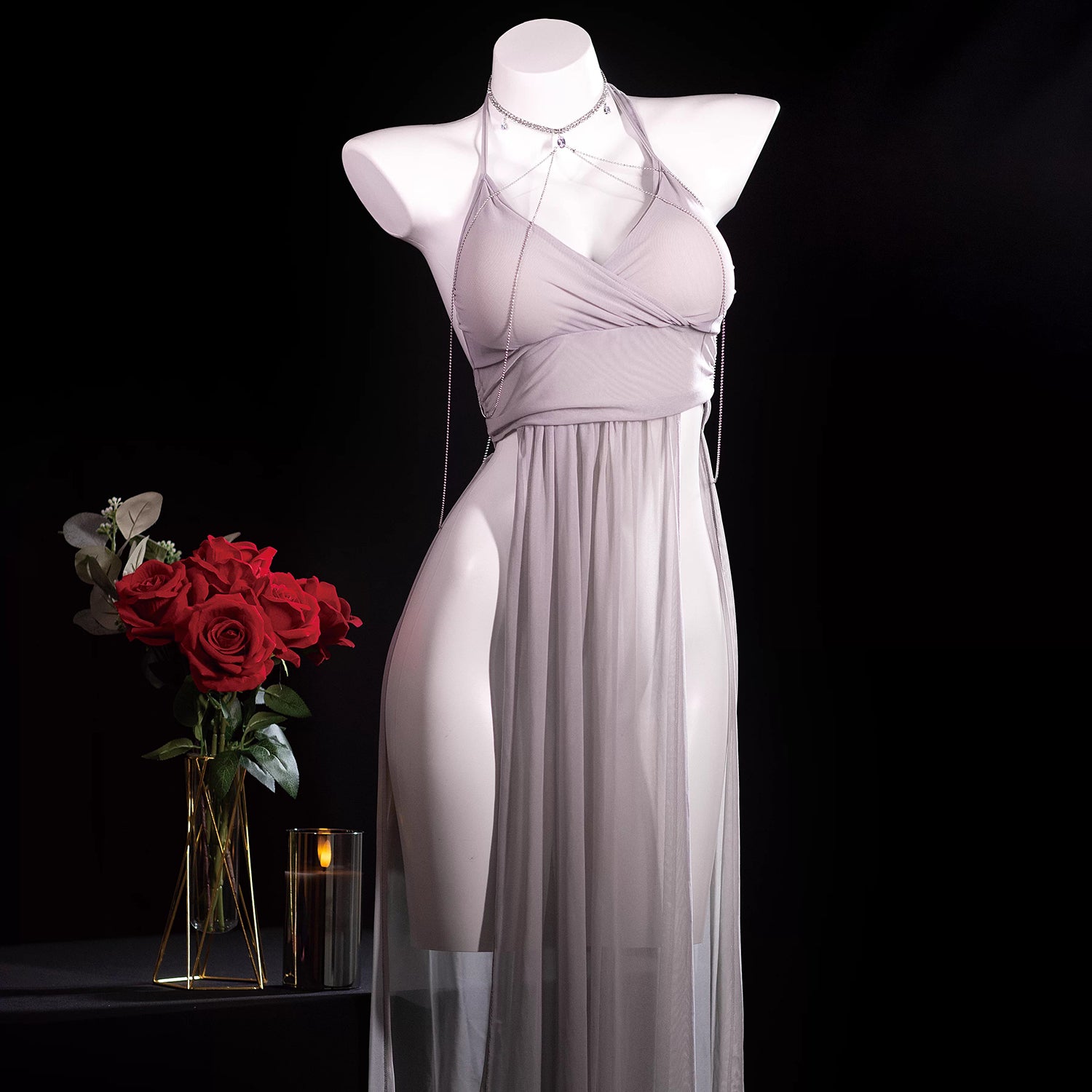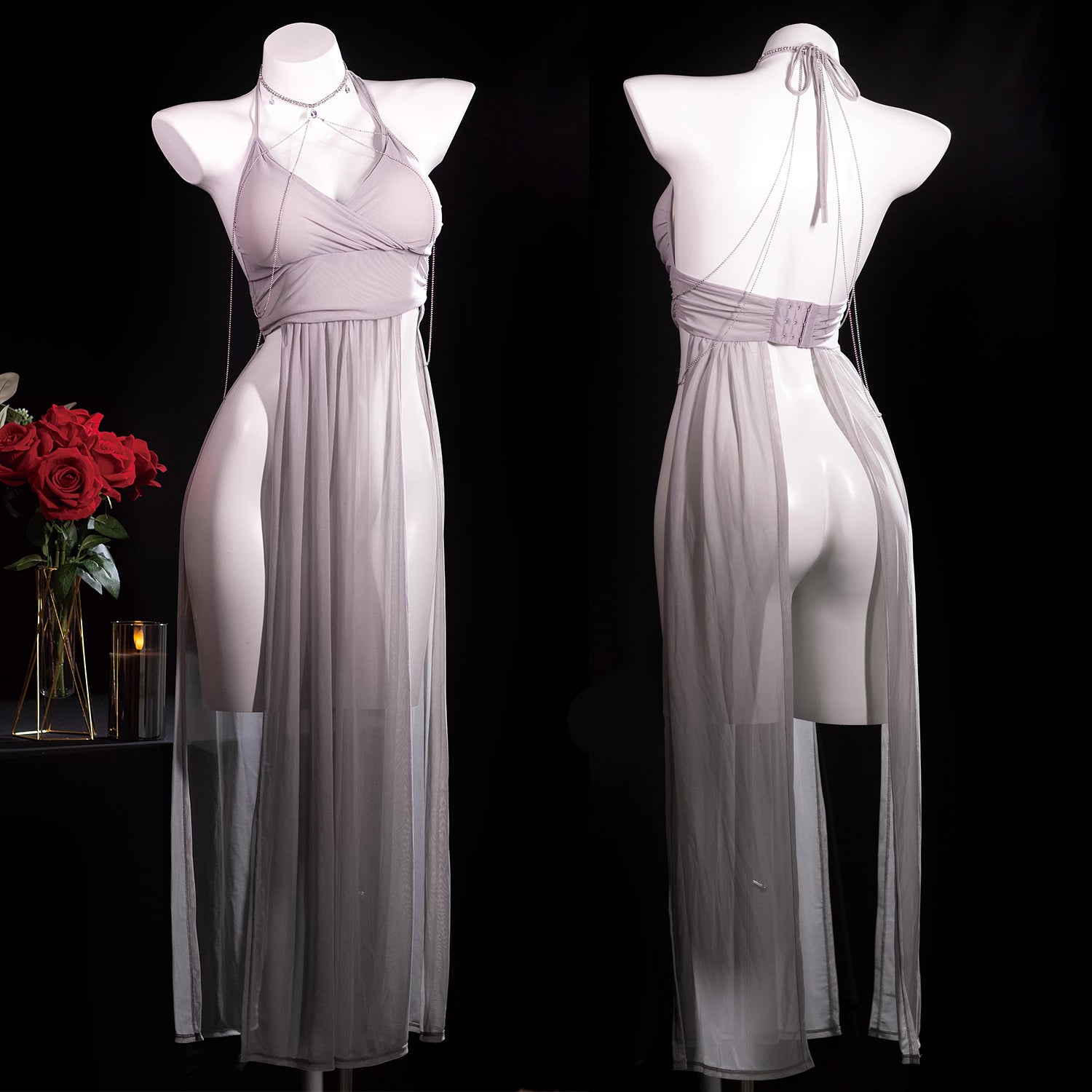 深めのVネックと大胆なスリットデザインが、脚線美とデコルテを美しく演出するグレーシンデレラロングドレスセットです!