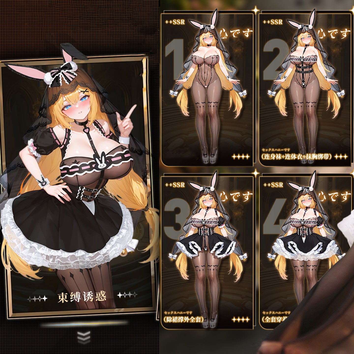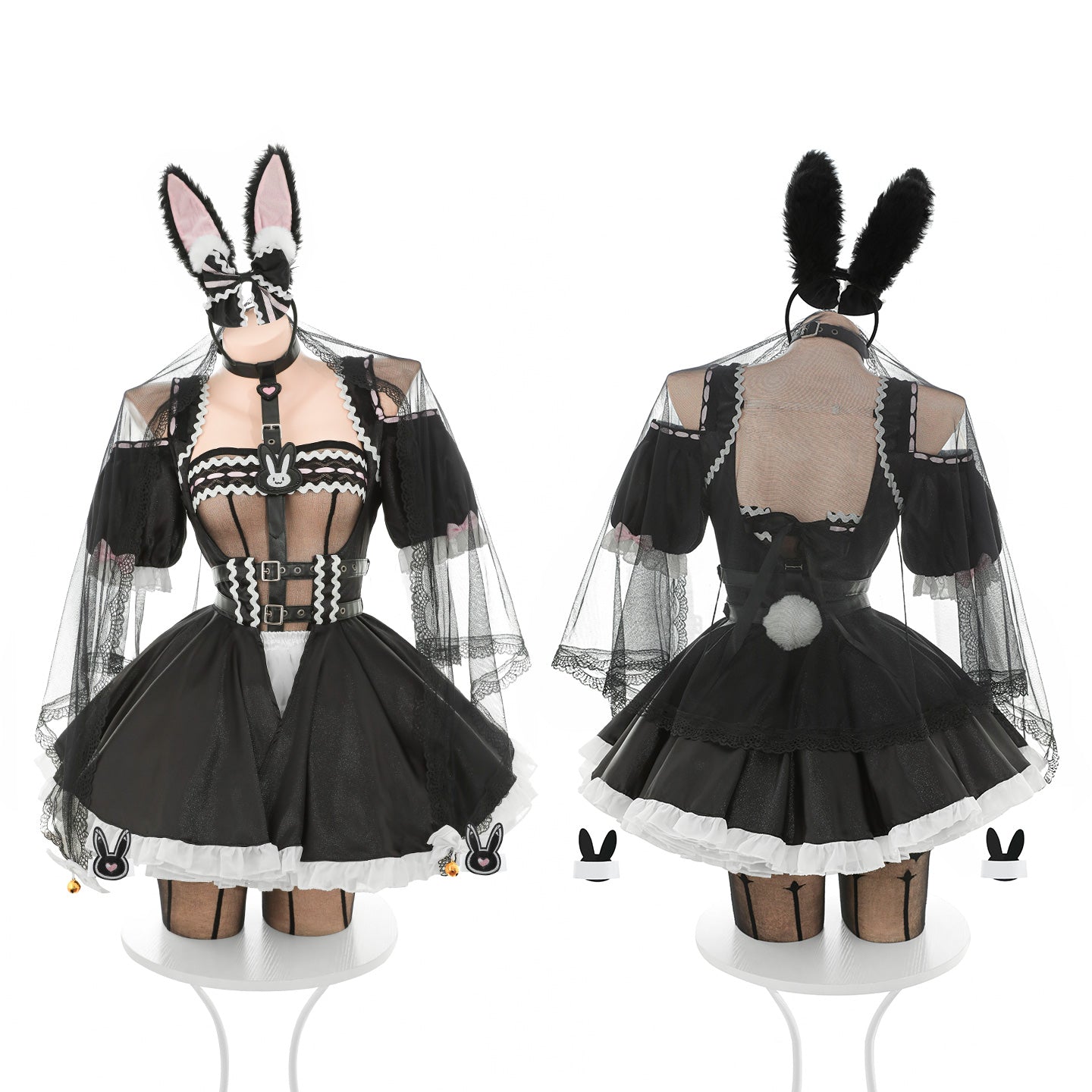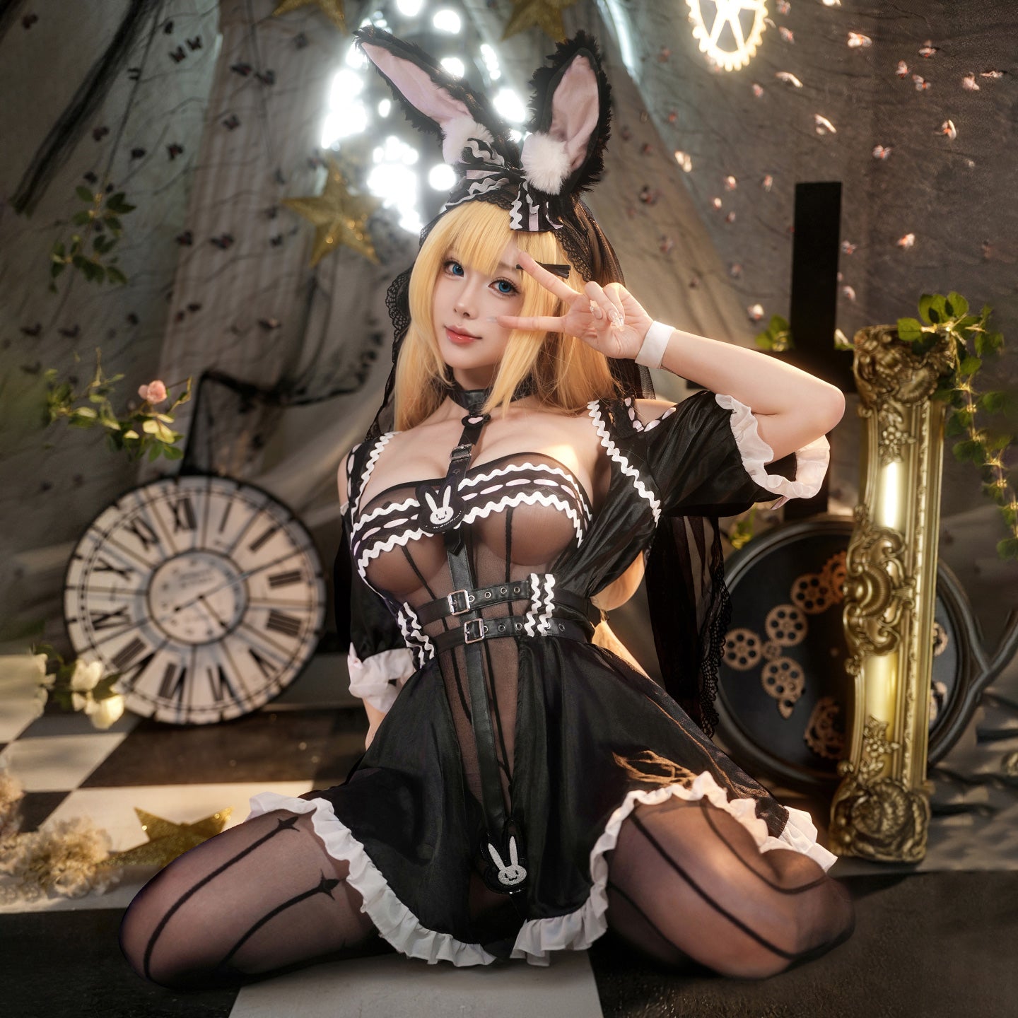 バニー耳とフリルスカートが可愛らしさを演出しつつ、透け透けストッキングが脚線美を強調。