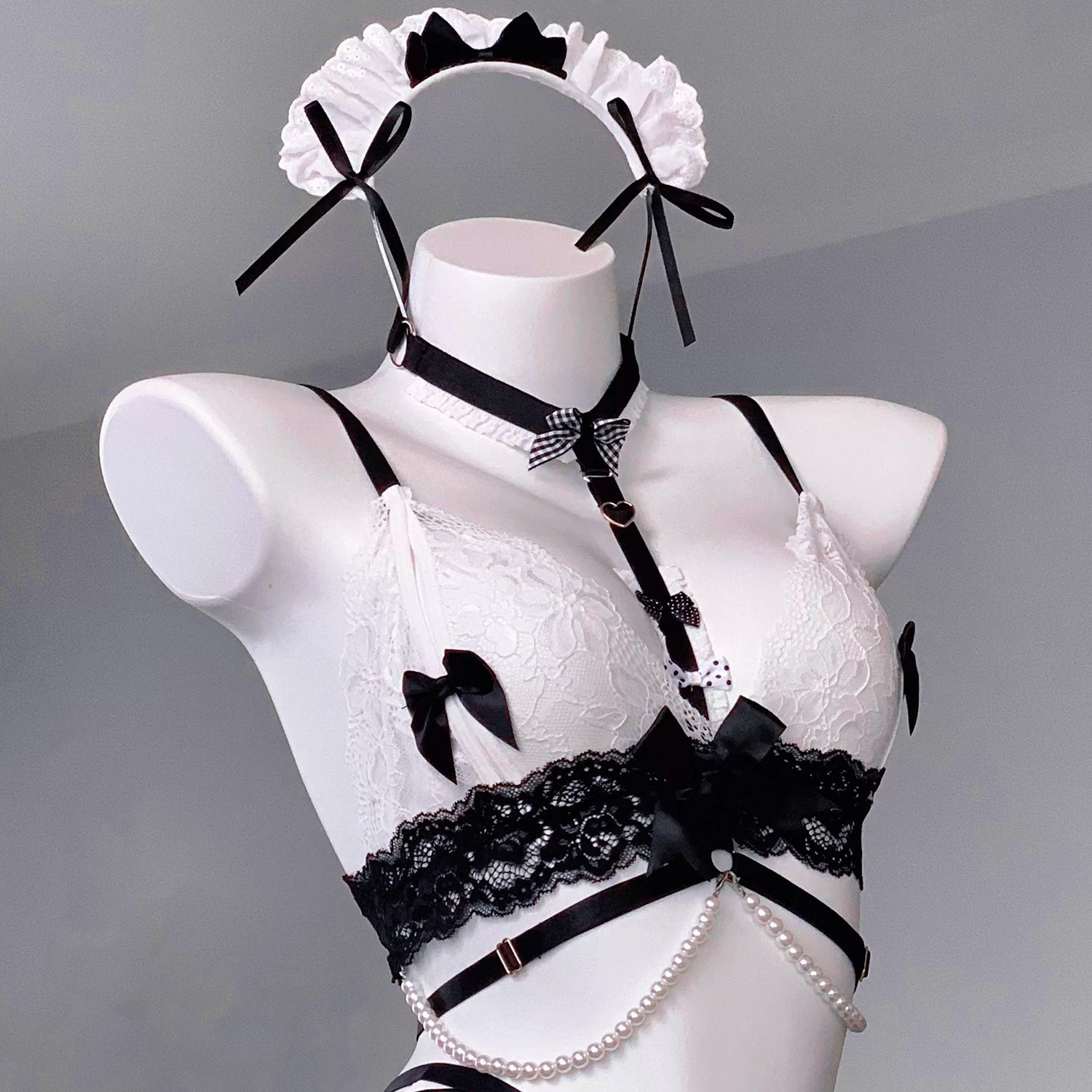 ブラック×ホワイトのコントラストが映える、メイド風のハーネスビキニセット。