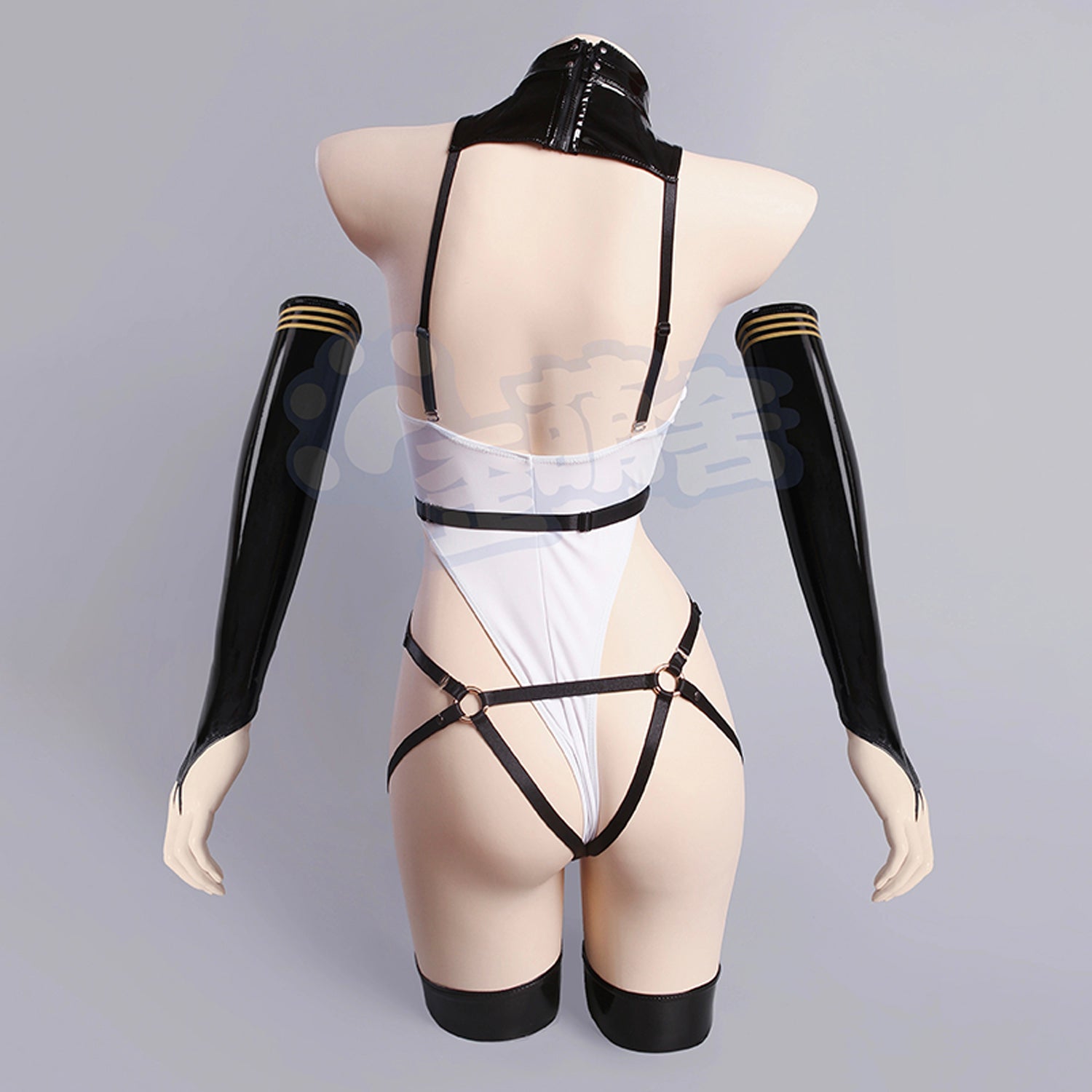 ホワイト×ブラックのコントラストに、ハイレグカットとガーターベルト風ストラップが組み合わさり、クールで大胆なシルエットを演出♥