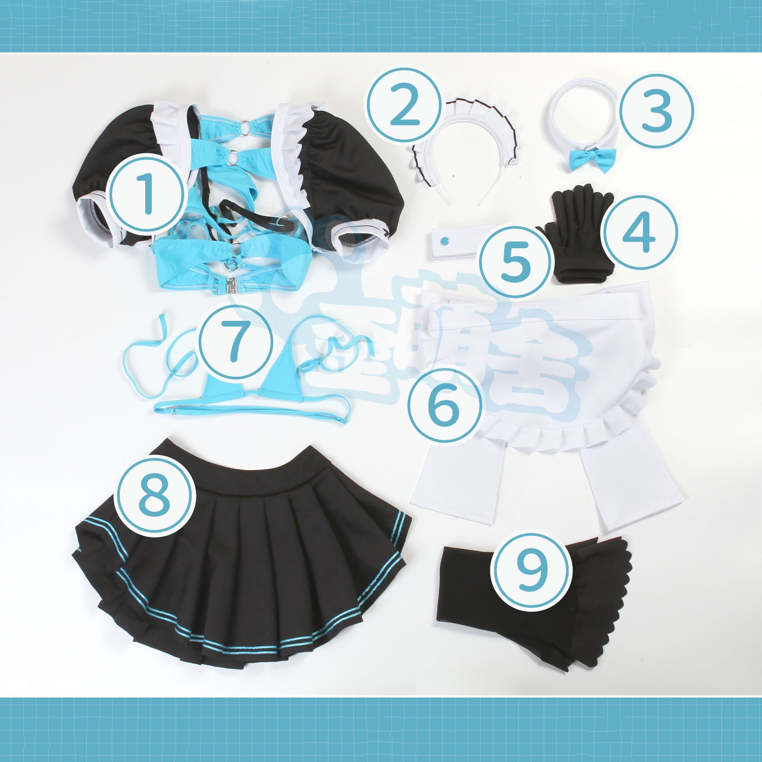 【商品内容】トップス、ビキニ、スカート、エプロン、ニーハイソックス*2、腕輪*2、手袋*2、カチューシャ、チョーカー