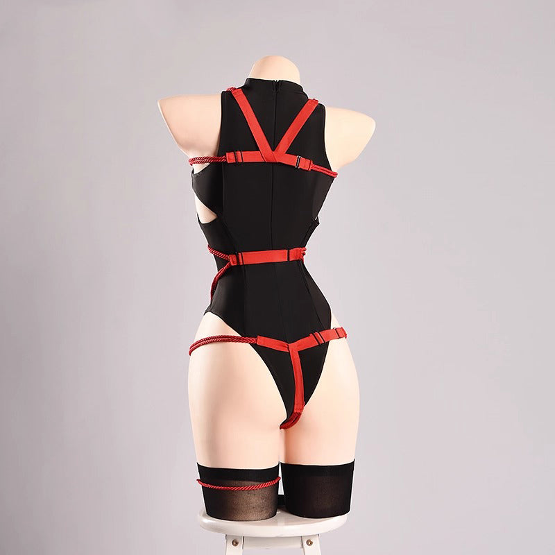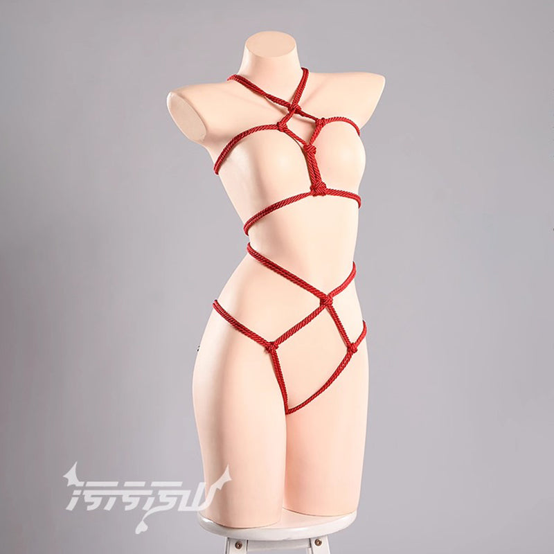 ブラックベースに映えるレッドロープの交差デザインが、束縛感と誘惑を同時に演出し、危うい色気をプラスします。