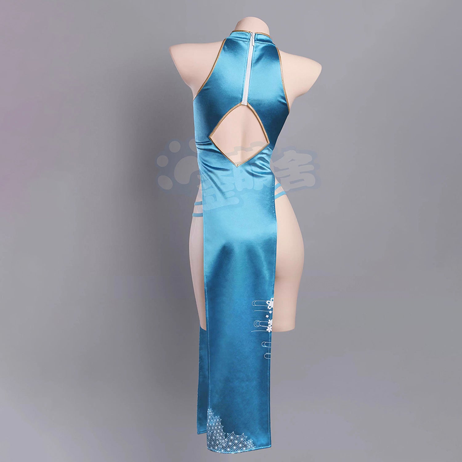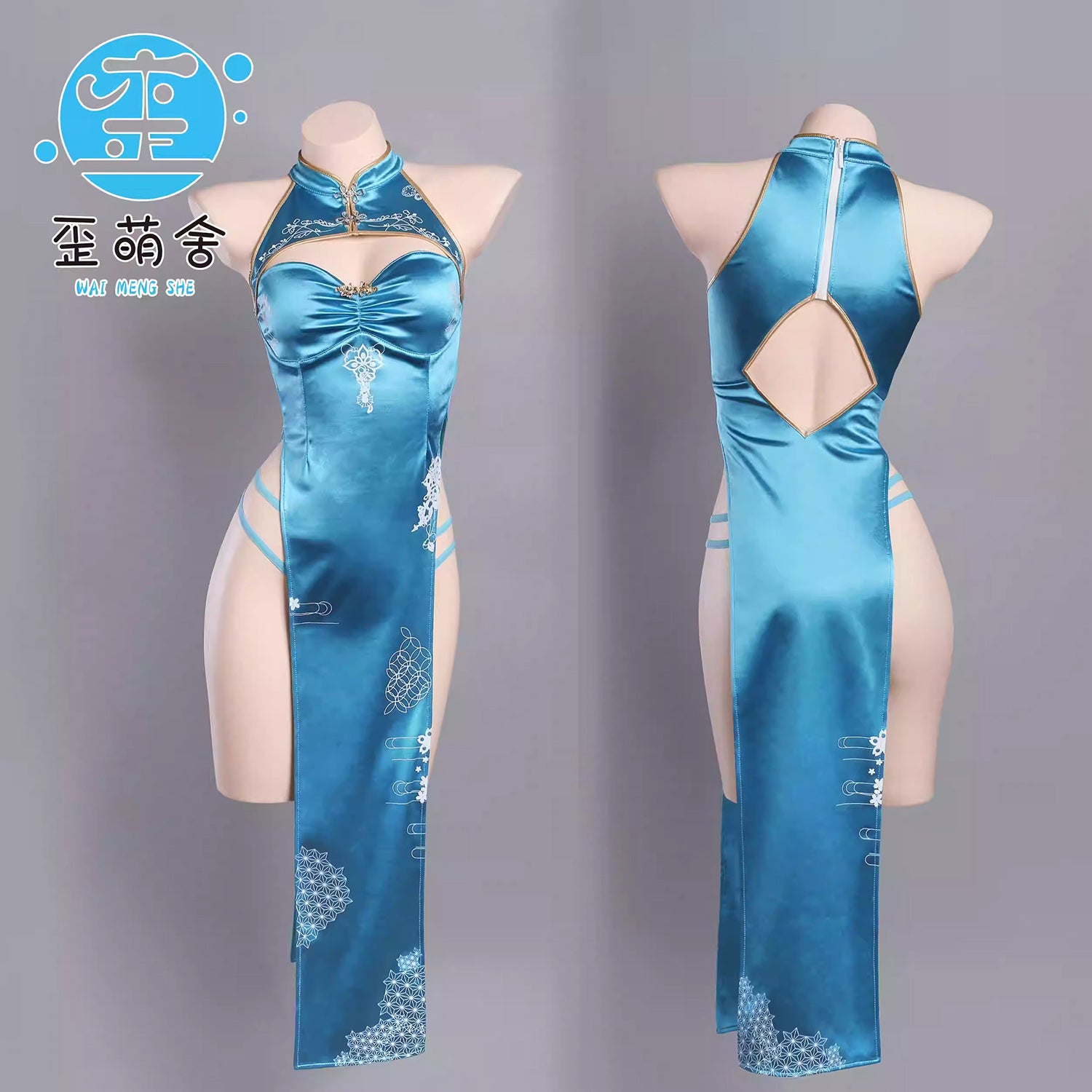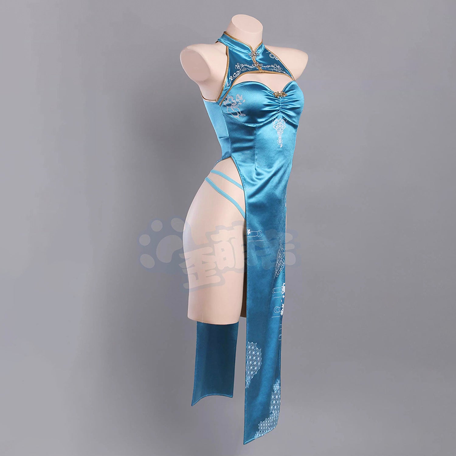 胸元のカットアウトと大胆なスリットが特徴で、鮮やかなブルーのチャイナドレスが魅力を引き立てます。女性らしい曲線を強調し、セクシーさと優雅さを兼ね備えた仕上がり◎