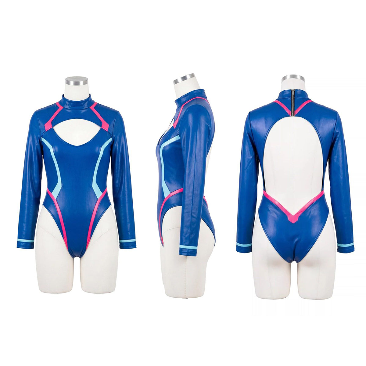 なめらかな光沢を放つ青色エナメルハイレグレオタード ユニセックス 7XLまで展開【FEATURIUM】