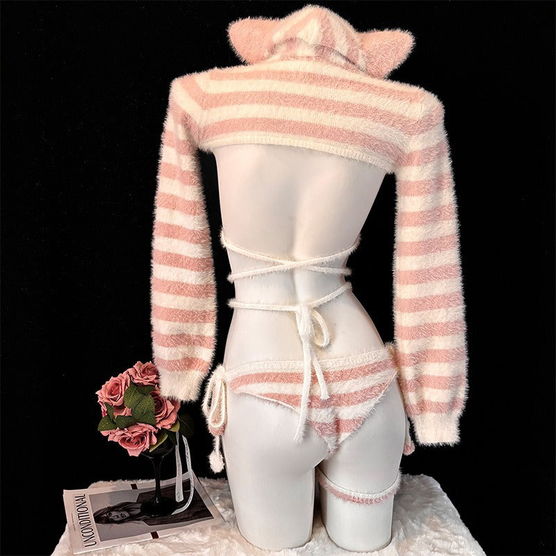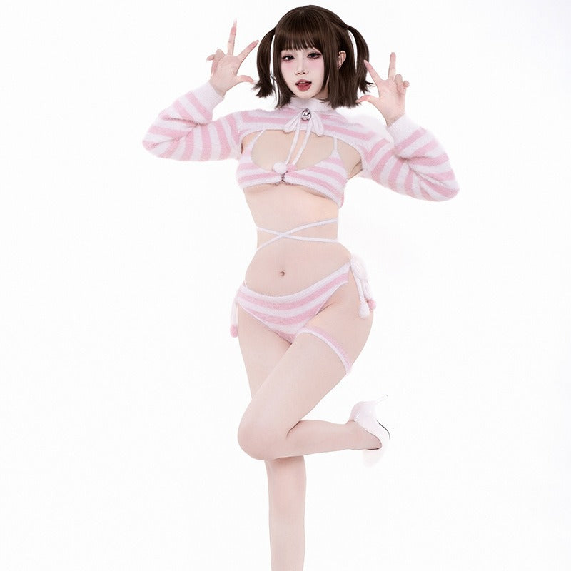 上はオープン風デザイン、下はサイドが結べるリボン仕様で、自由にフィット感を調整可能。ふわもこ素材なのに超セクシー。
