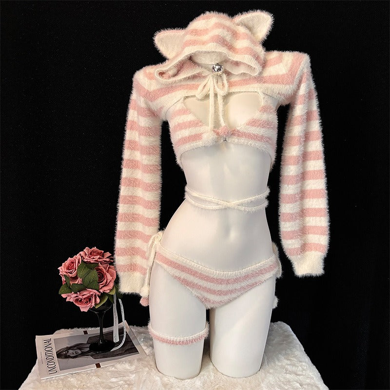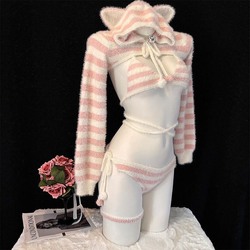 ふわもこボーダー柄にゃんこファービキニセット 猫耳フード付き ピンク【BOLOLI】