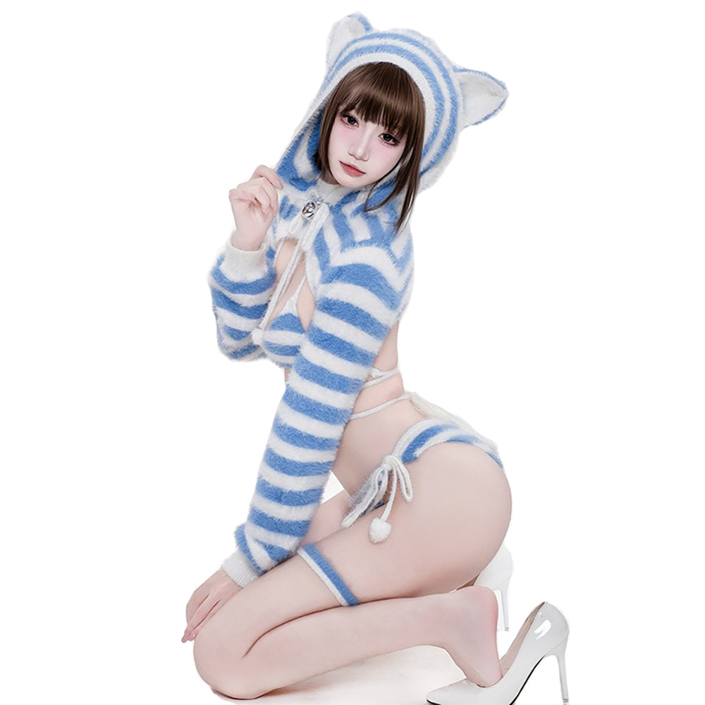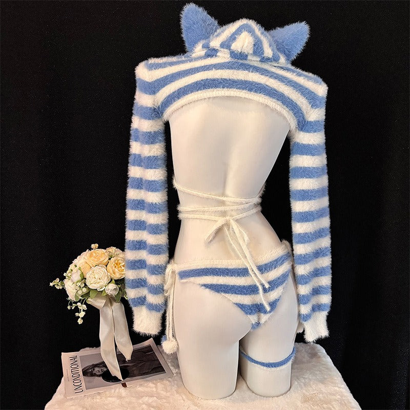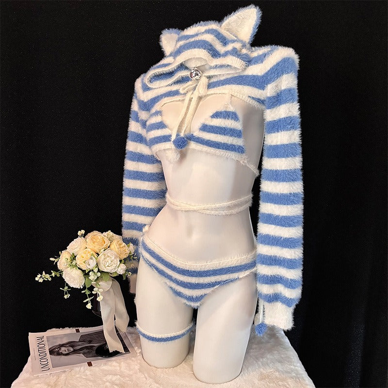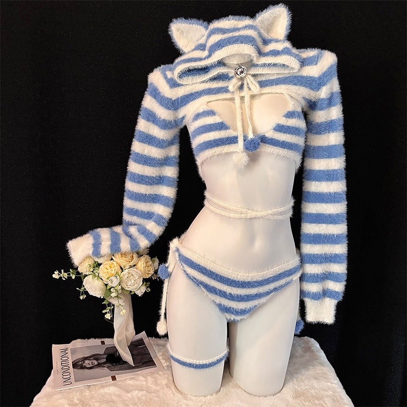 ふわもこボーダー柄にゃんこファービキニセット 猫耳フード付き ブルー【BOLOLI】