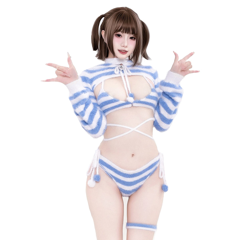 上はオープン風デザイン、下はサイドが結べるリボン仕様で、自由にフィット感を調整可能。ふわもこ素材なのに超セクシー。