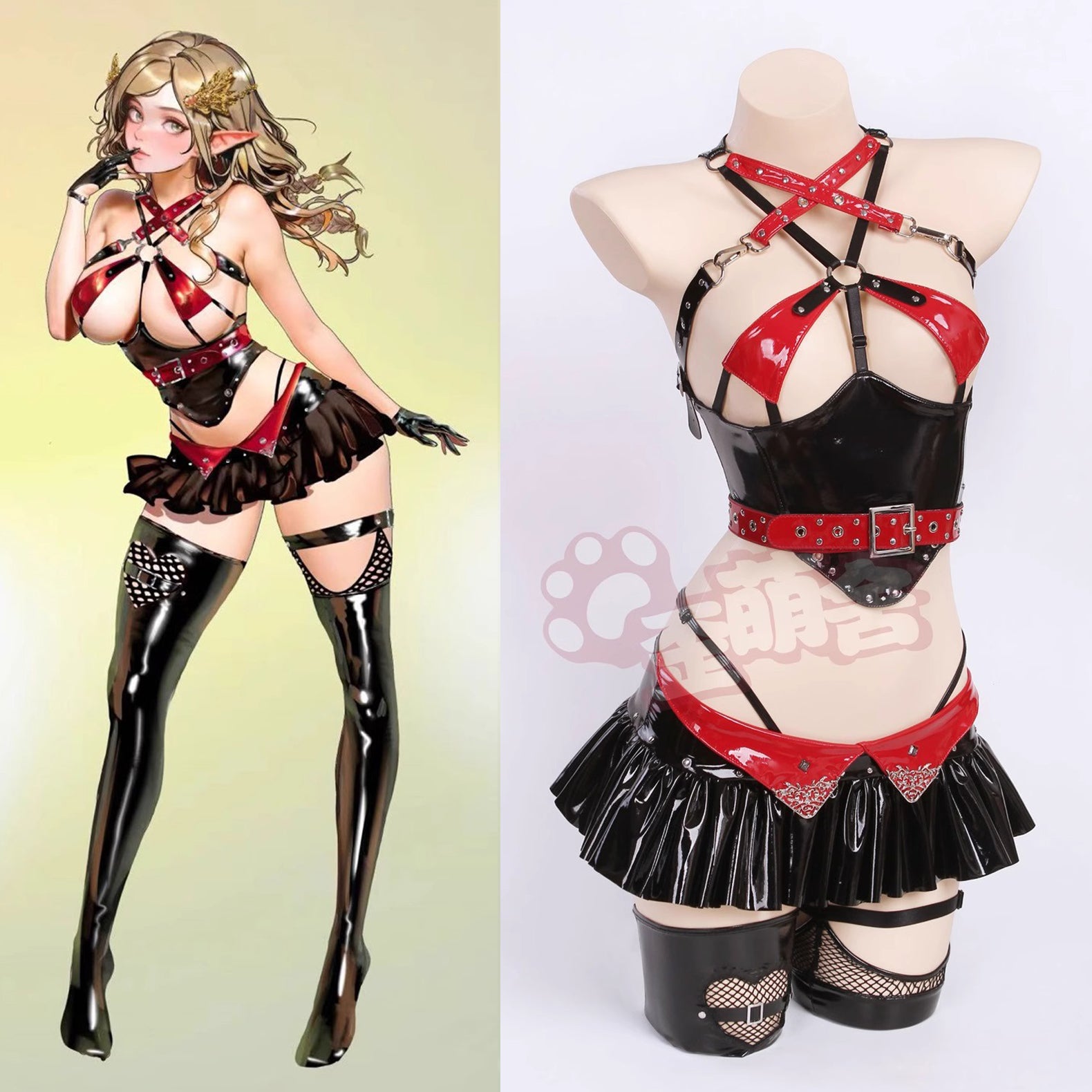 艶やかなエナメル素材のコルセットとミニスカートでボディラインをシャープに演出。