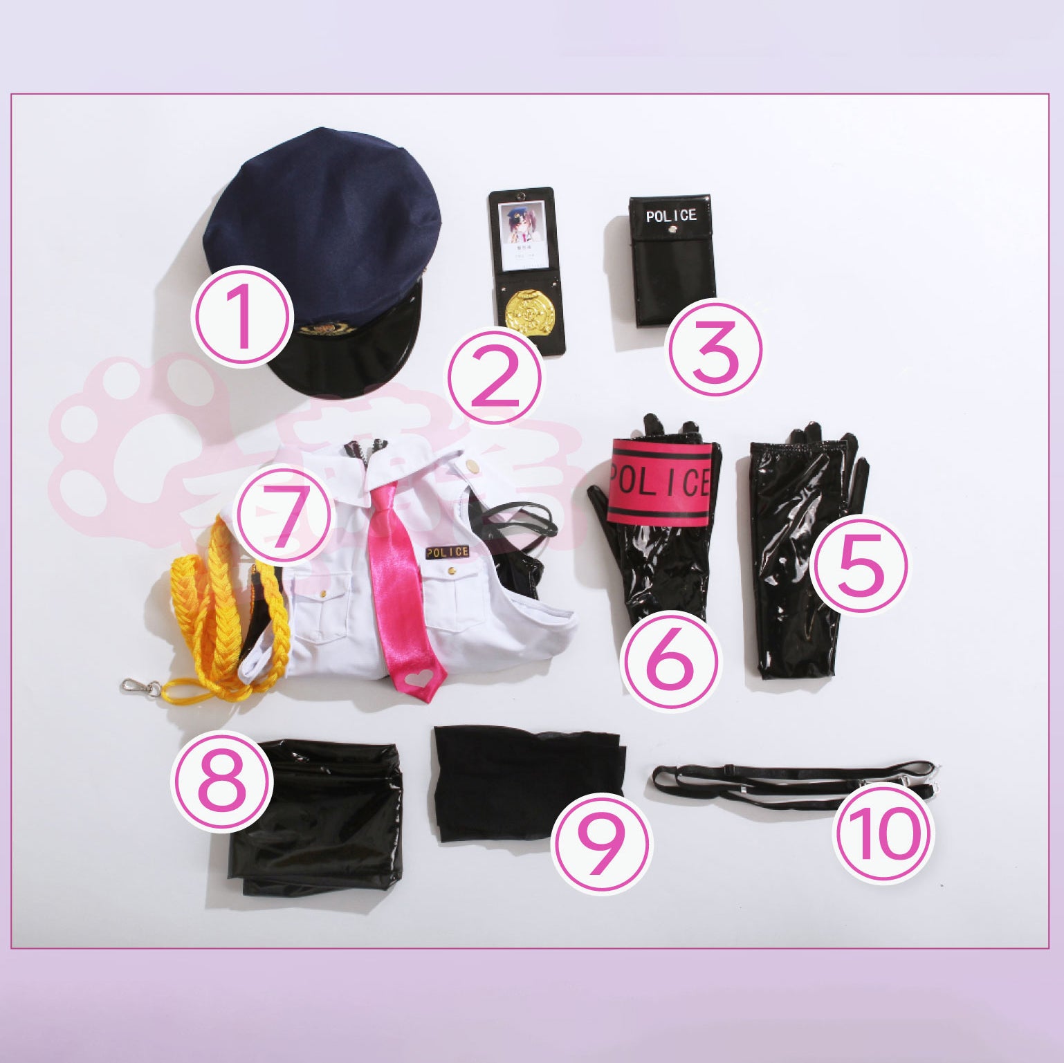【商品内容】レオタード、ポリス帽子、IDカード、太腿バッグ、通常手袋*2、腕章付き手袋*2、PUレザーストッキング*2、ストッキング*2、肩ストラップ