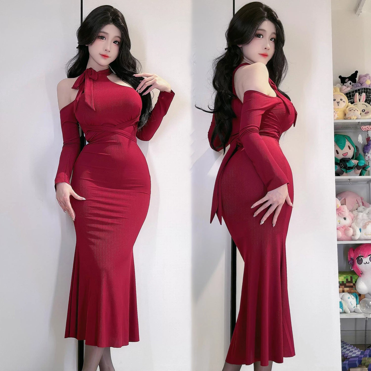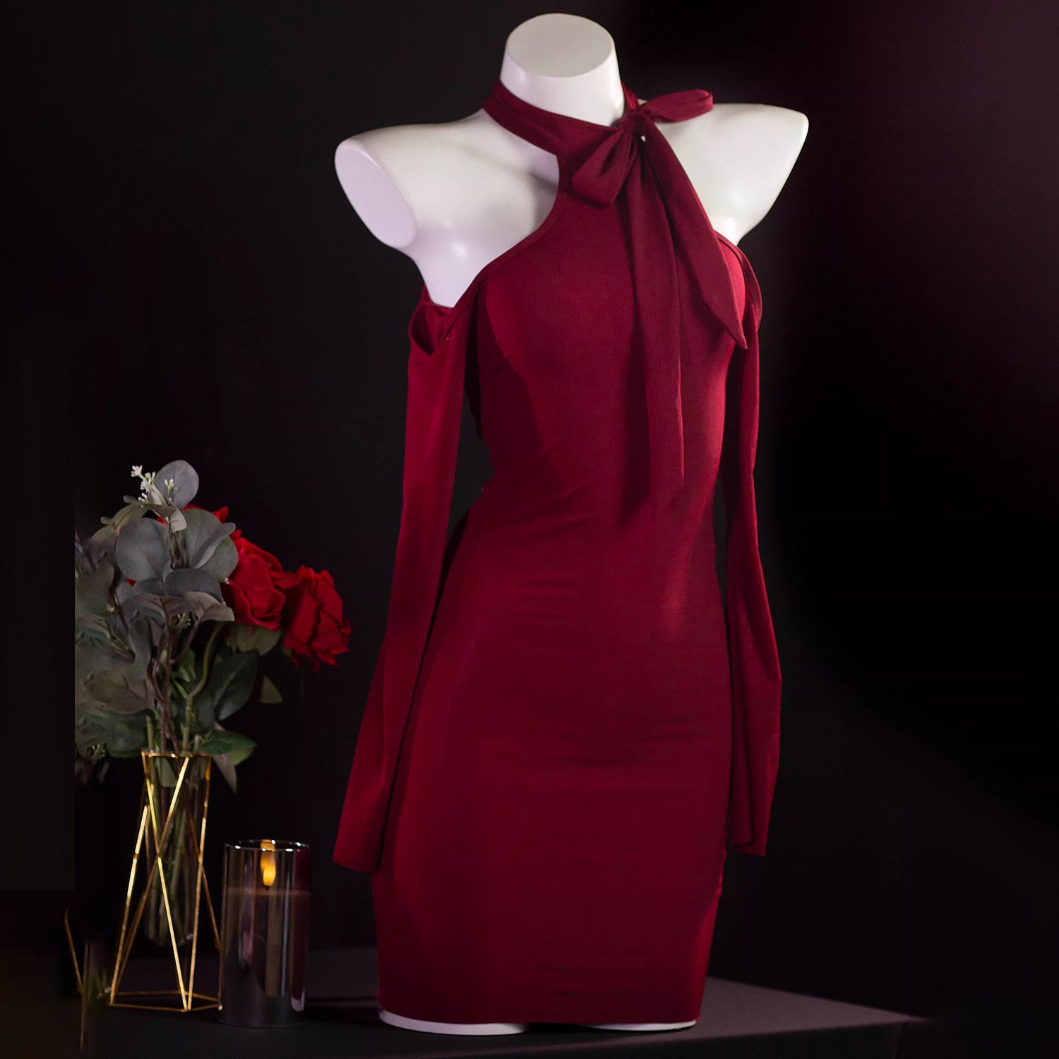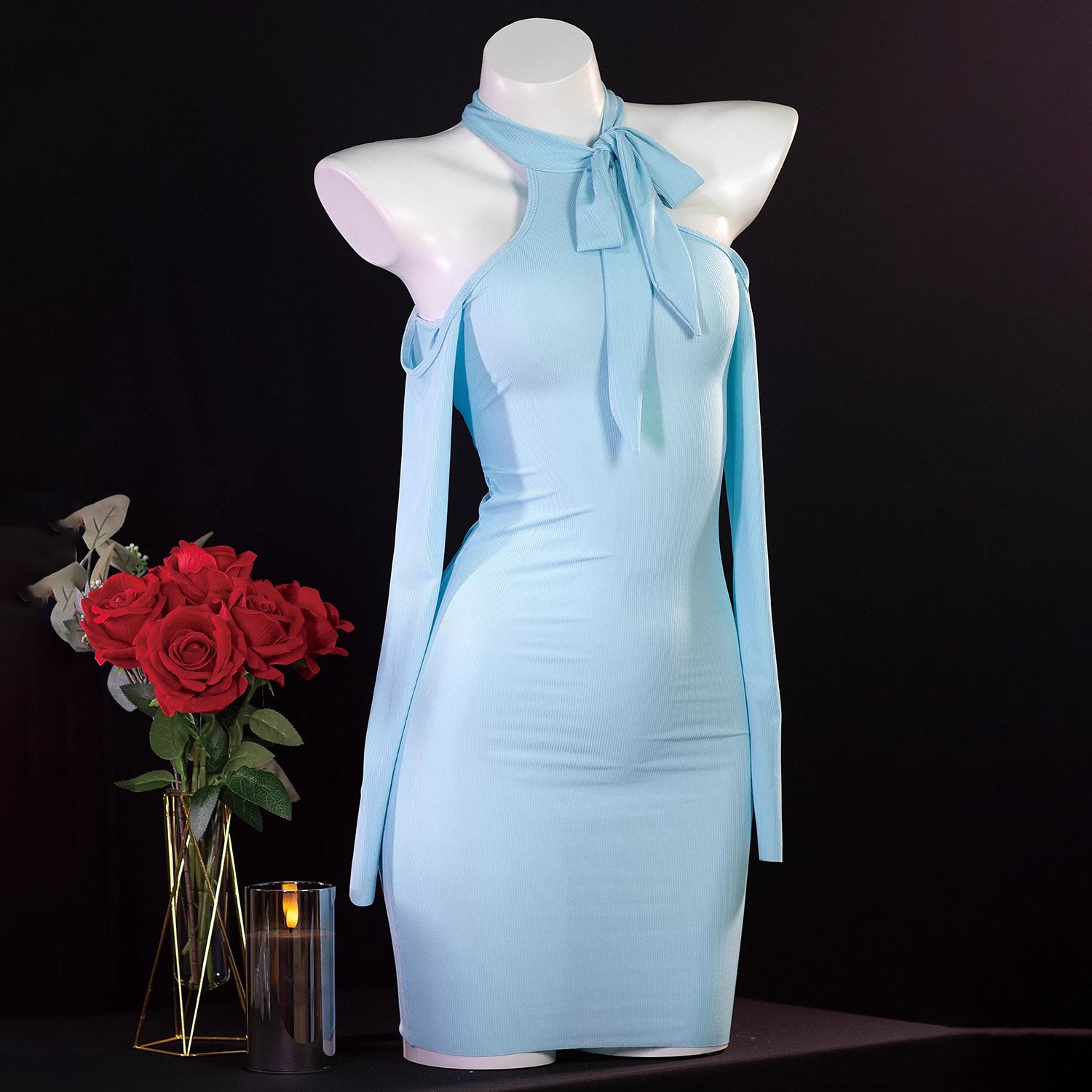 曲線美を極めるフェミニンなホルターネックタイトドレス 水色/レッド/パープル/ピンク【TANG YUAN】