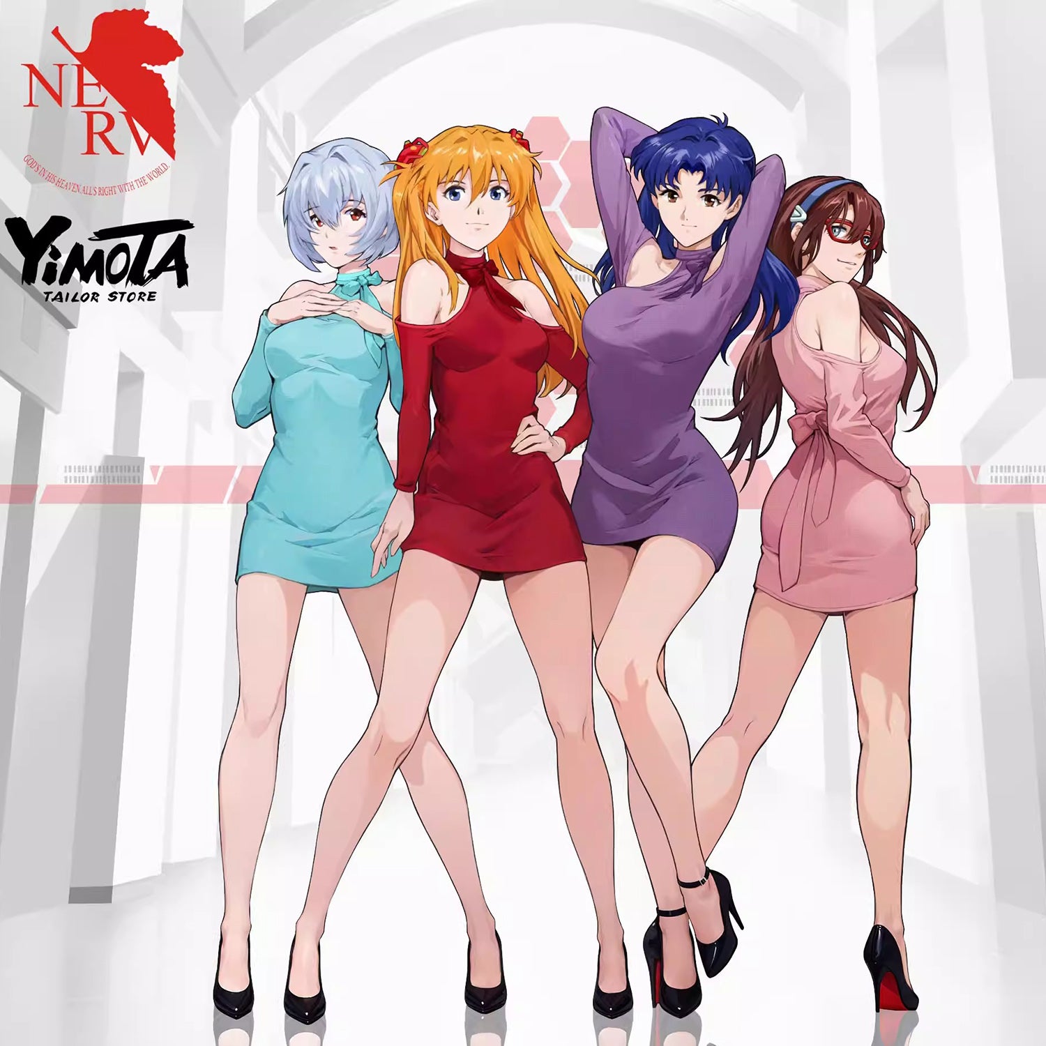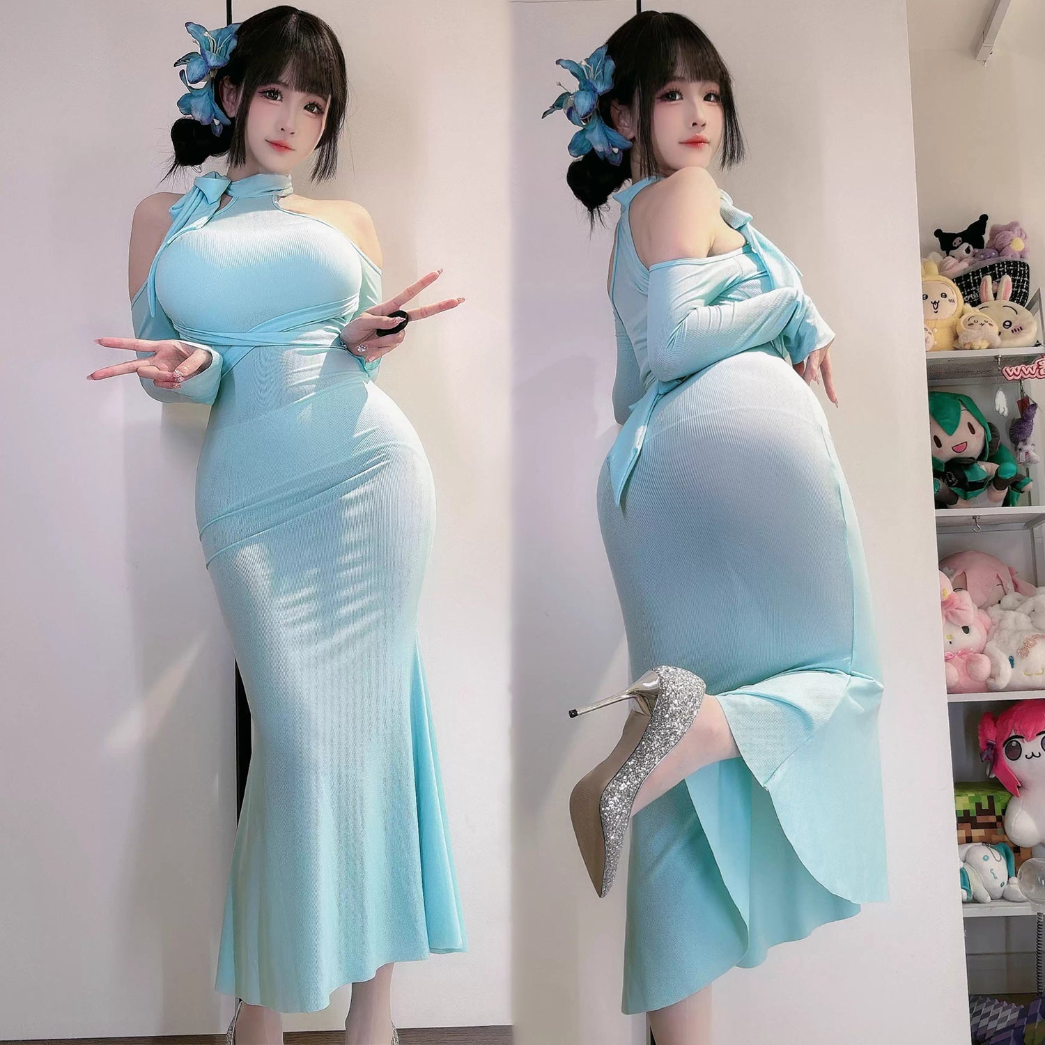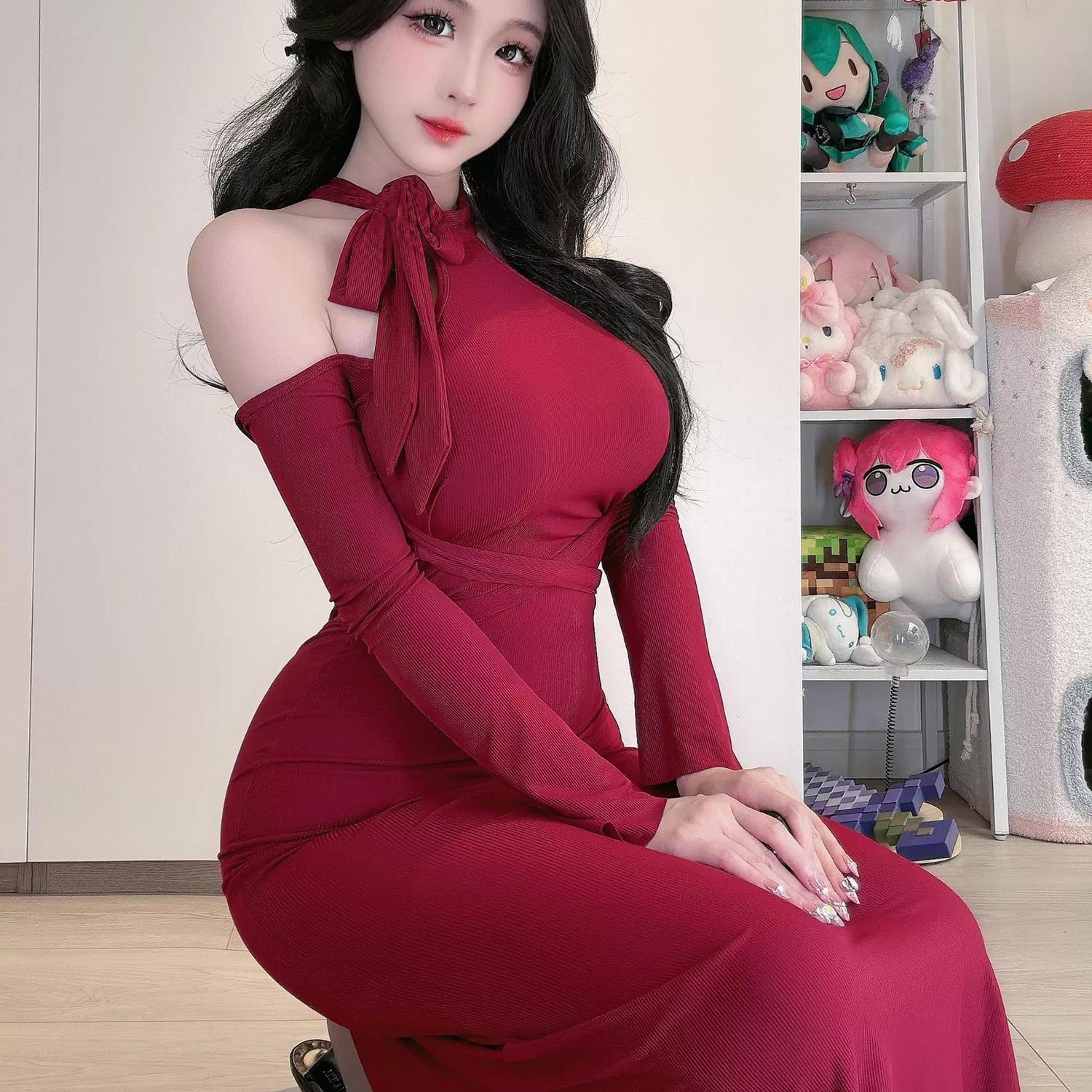 曲線美を極めるフェミニンなホルターネックタイトドレス 水色/レッド/パープル/ピンク【TANG YUAN】