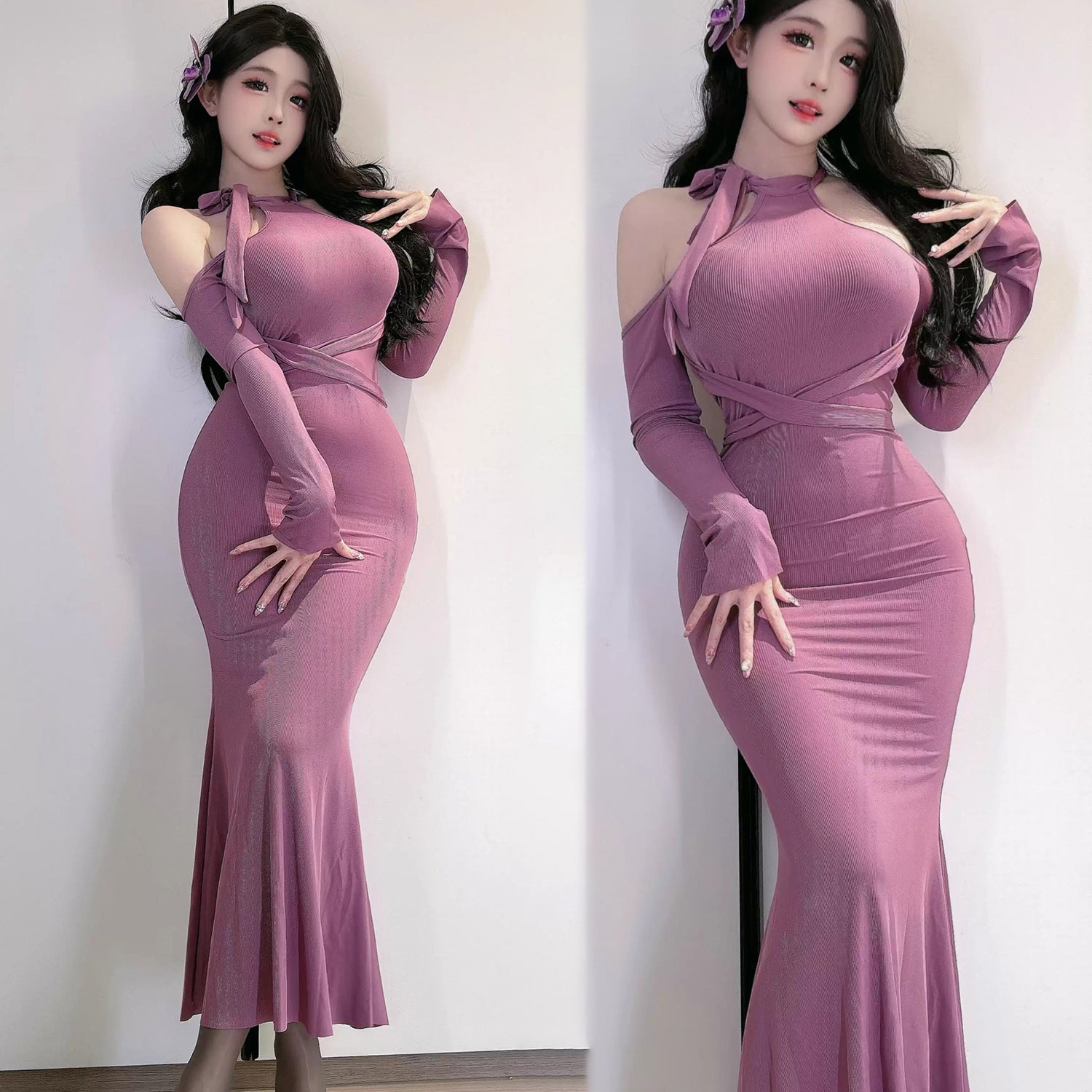 しなやかに身体に沿い、女性らしい曲線を美しく際立たせるタイトロングドレス。