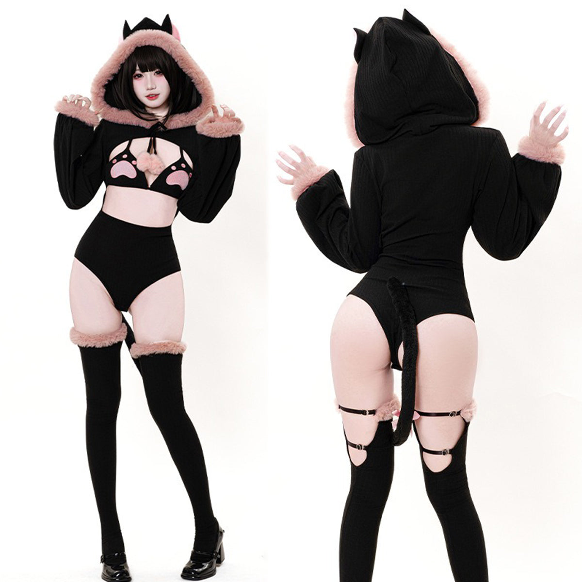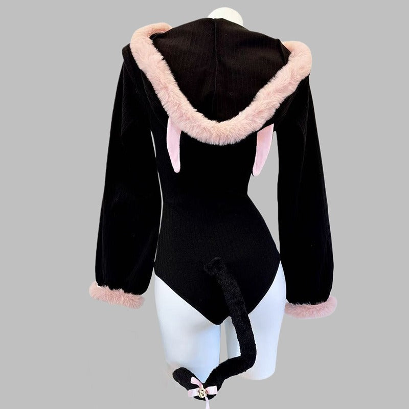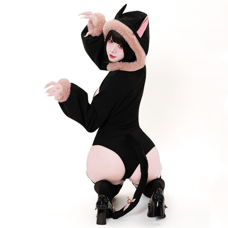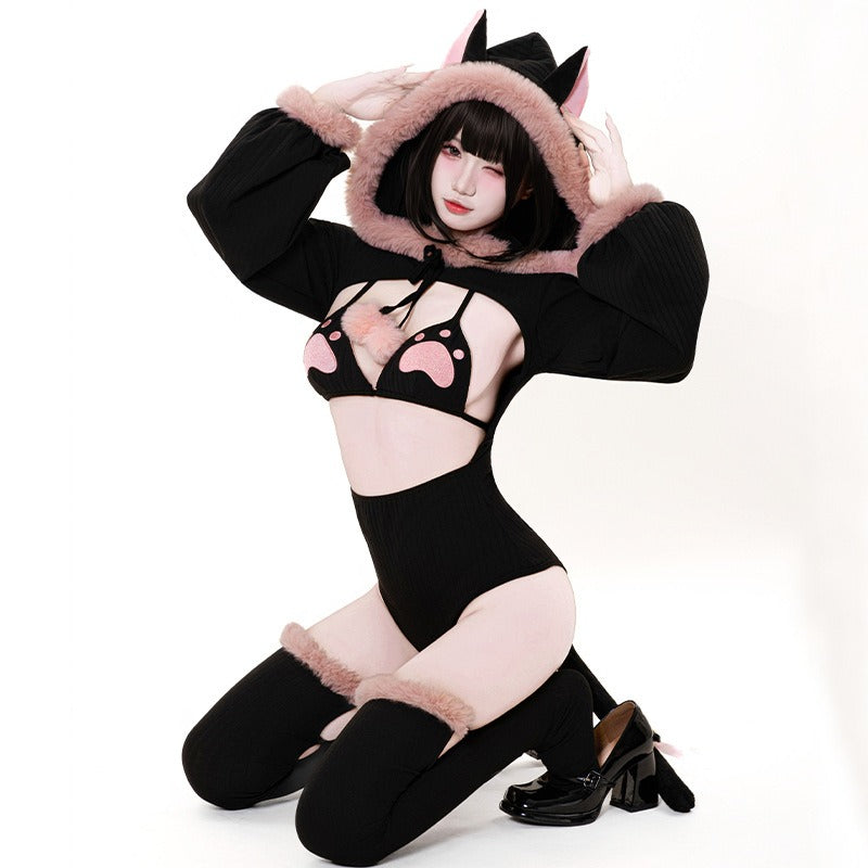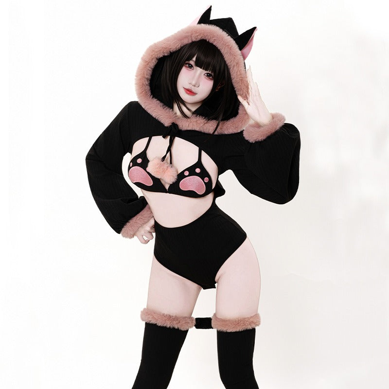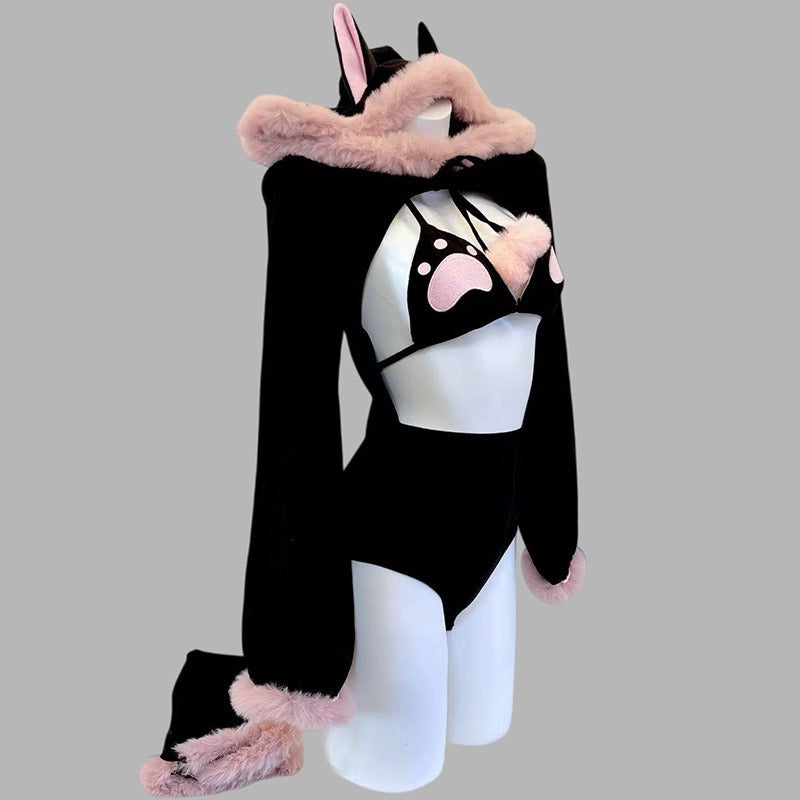 ネコ耳付きフードの愛らしさとボディラインを強調するレオタードビキニが、思わずドキッとさせる小悪魔的な魅力を演出❣️