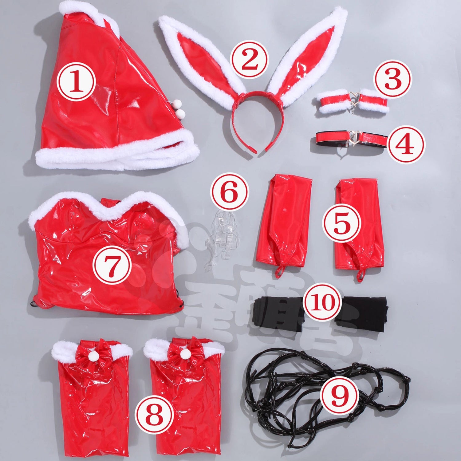 【商品内容】うさ耳、マント、レオタード、チョーカーA、チョーカーB、透明ストラップ、アームカバー*2、メッシュストッキング*2、赤エナメルストッキング*2、黒ボンデージストラップ