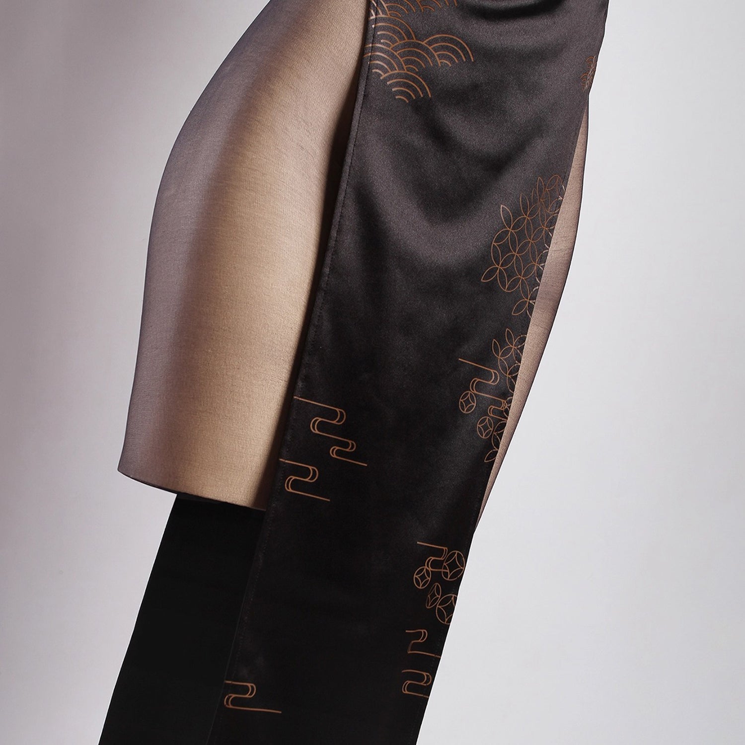 ボディラインを引き立てるサテン生地使用し、光沢感のあるブラックベースで高級感と妖艶さを演出。