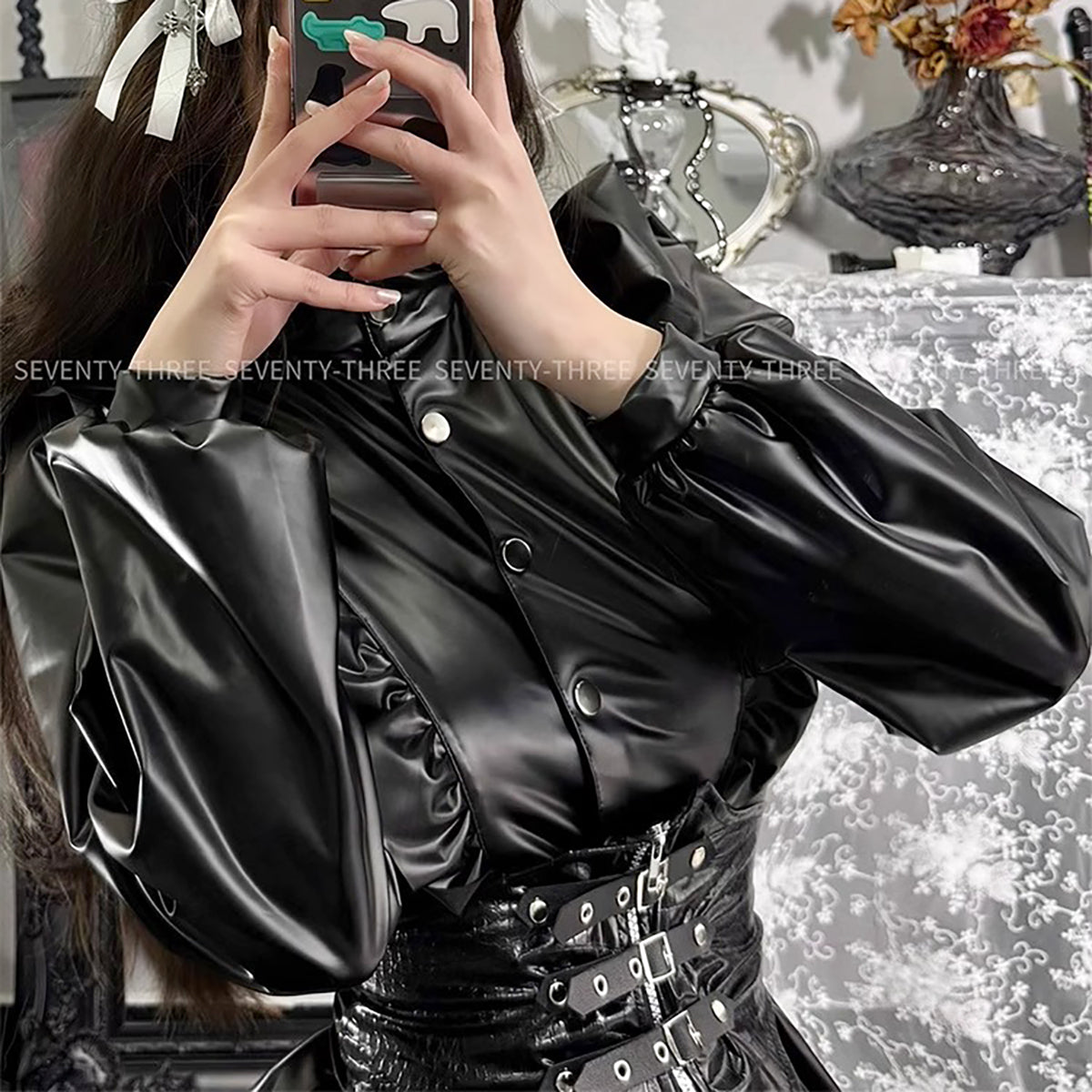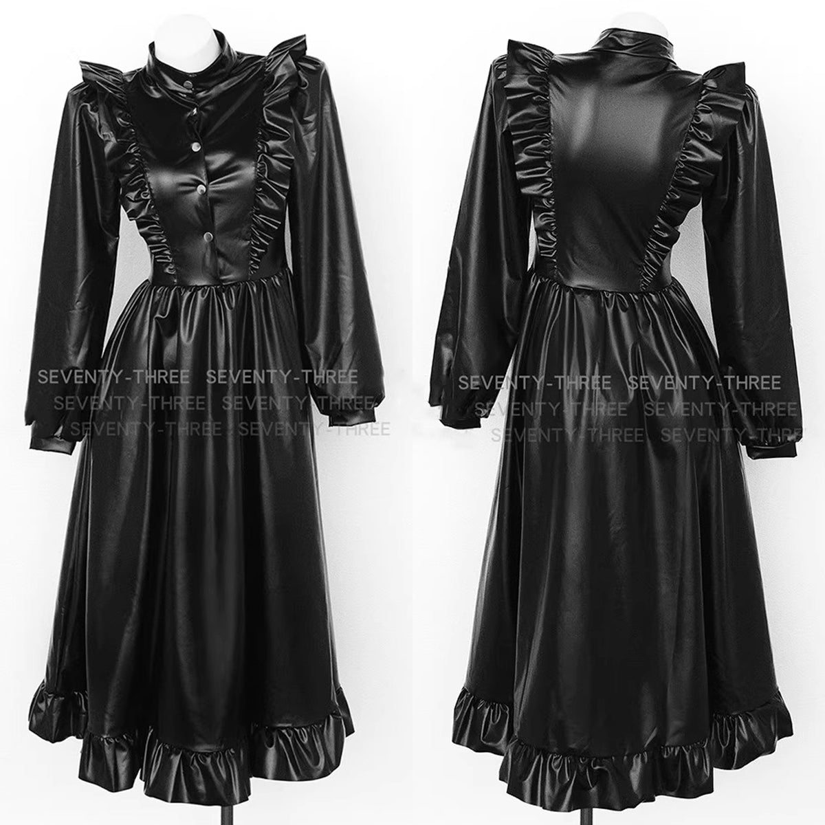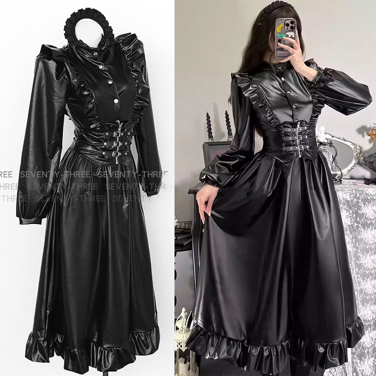 ゴシック地雷系光沢PUレザーのロング丈ダークメイドコスプレ【SEVENTY-THREE】