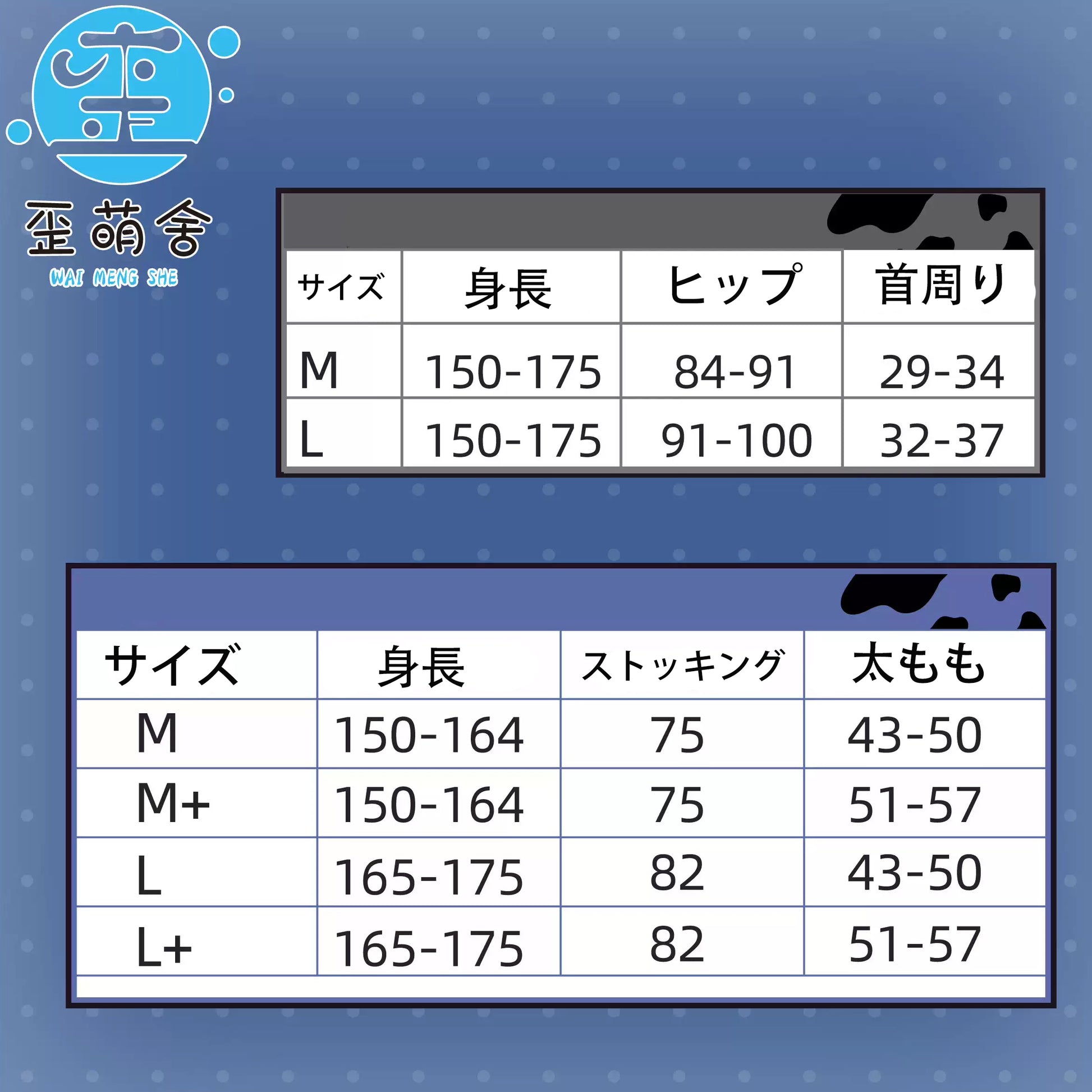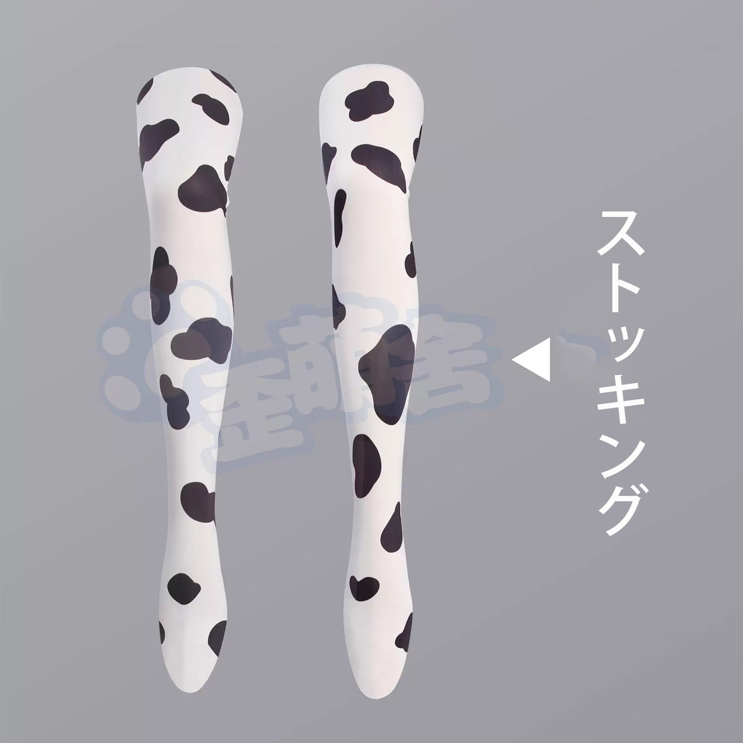 角付きカチューシャとカウベルチョーカーで、カウガールらしいキュートさと調教感をプラス。ロングアームカバー&ストッキングも付属し、全身を統一感のある牛柄でコーディネート。