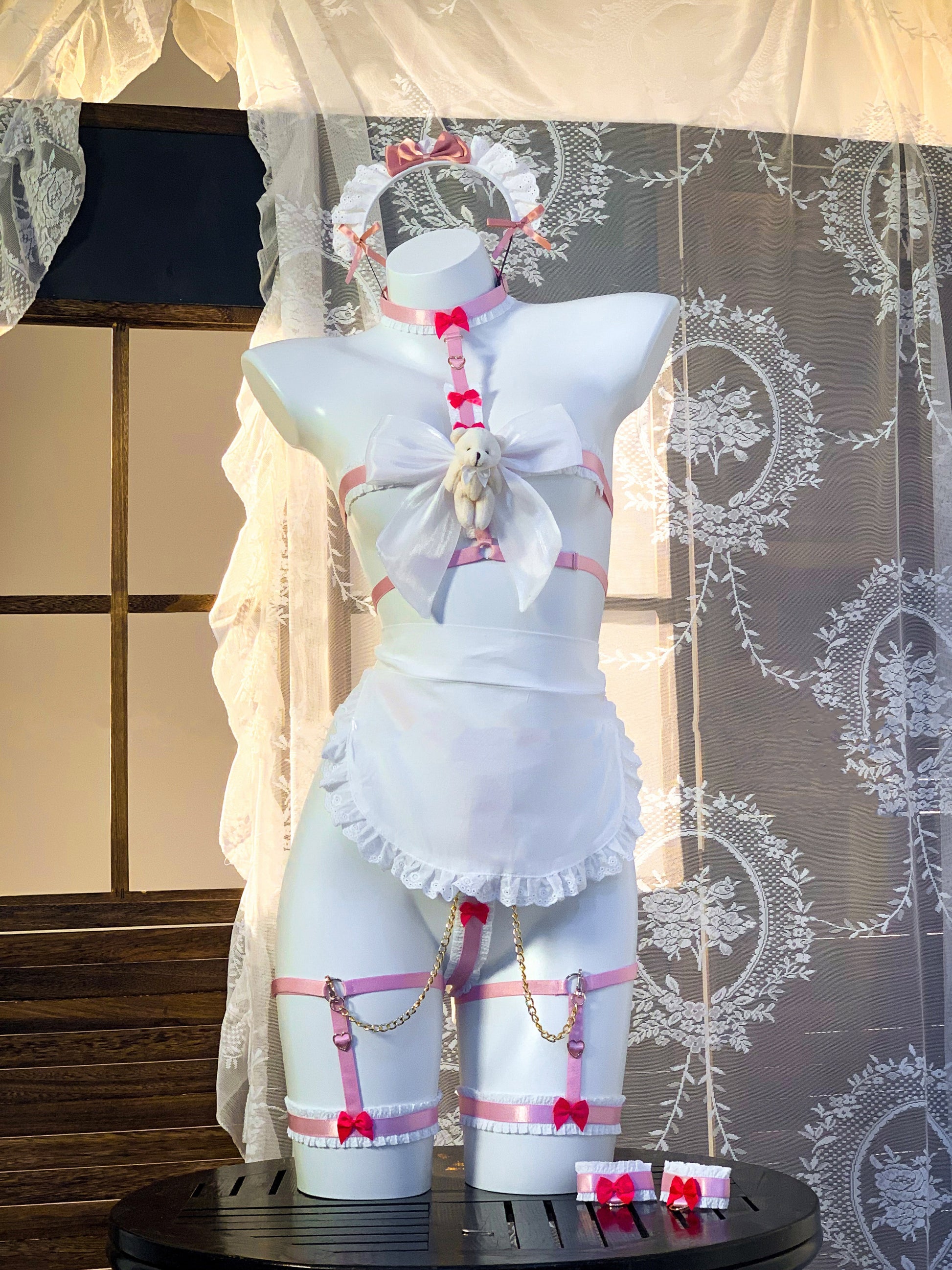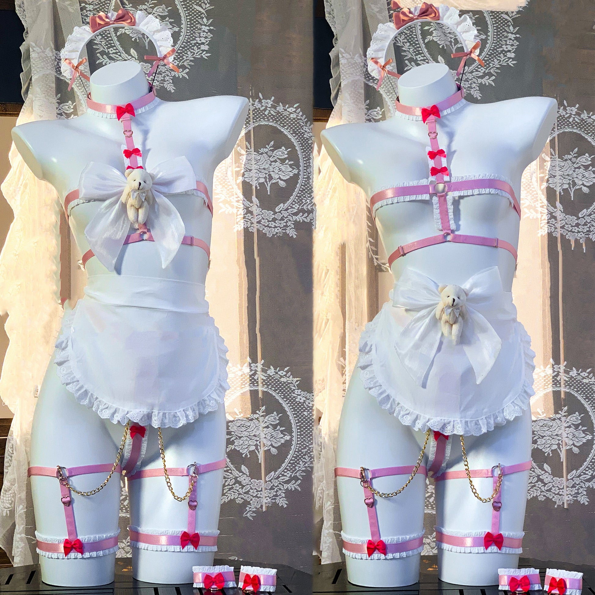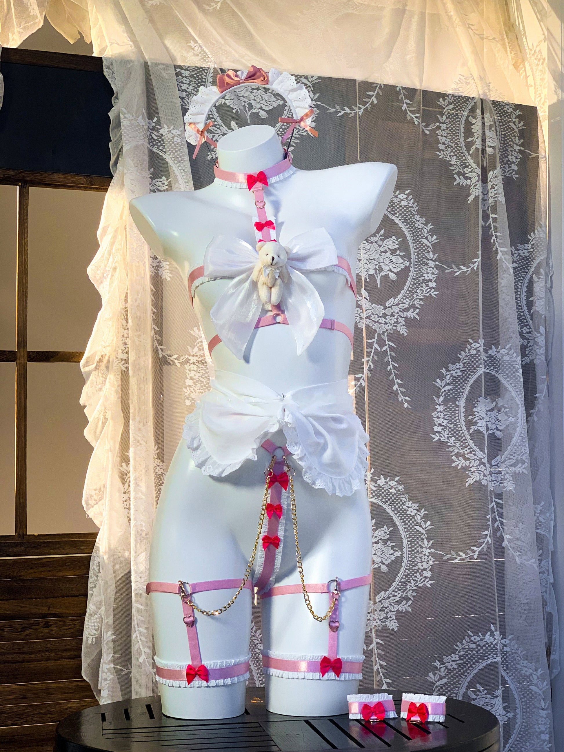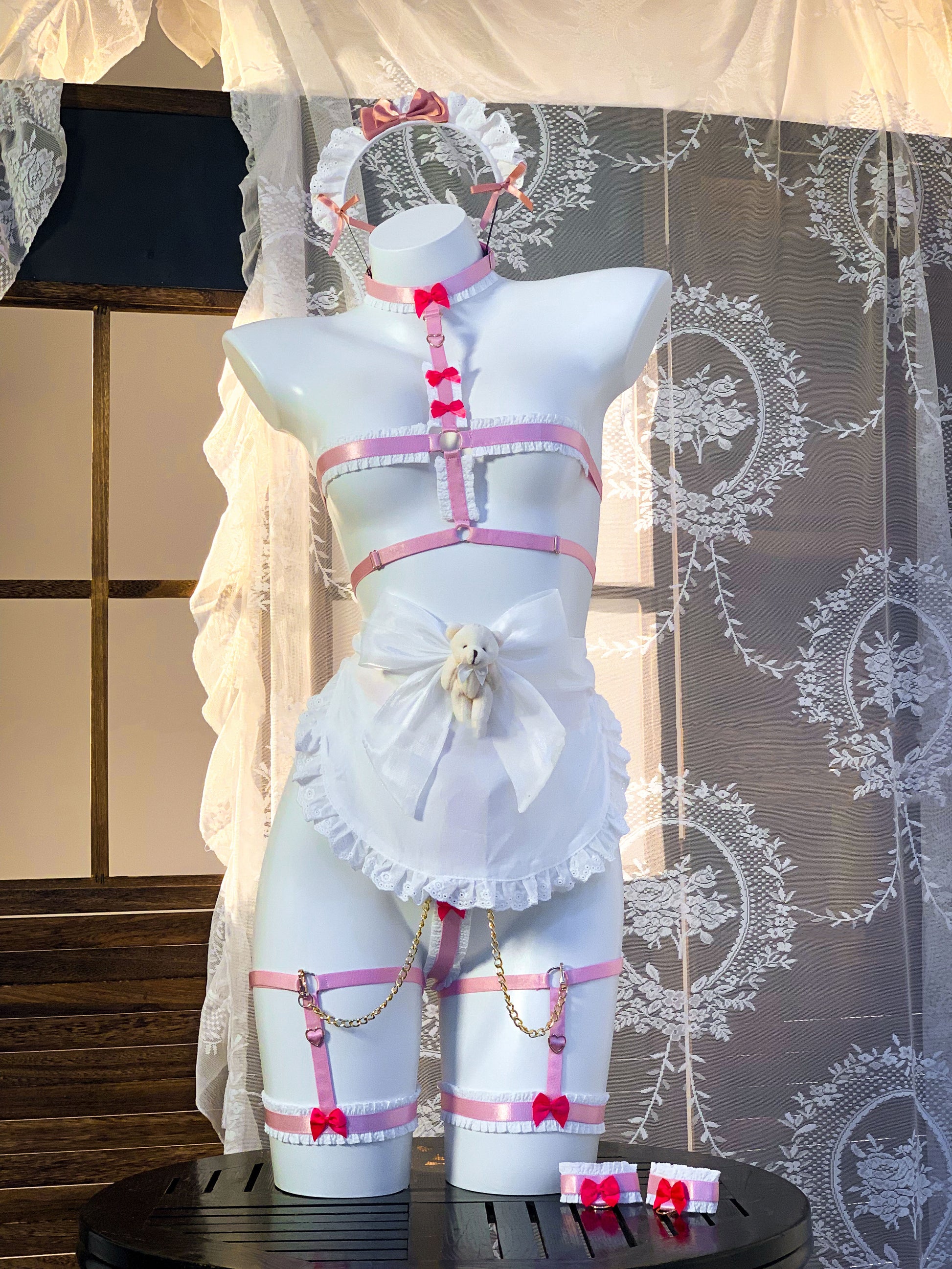 【商品内容】ハーネス、ワンピース、カチューシャ、腕輪*2、太もも輪*2、クマ付きのリボン、エプロン、メタルチェーン*2、ストッキング*2