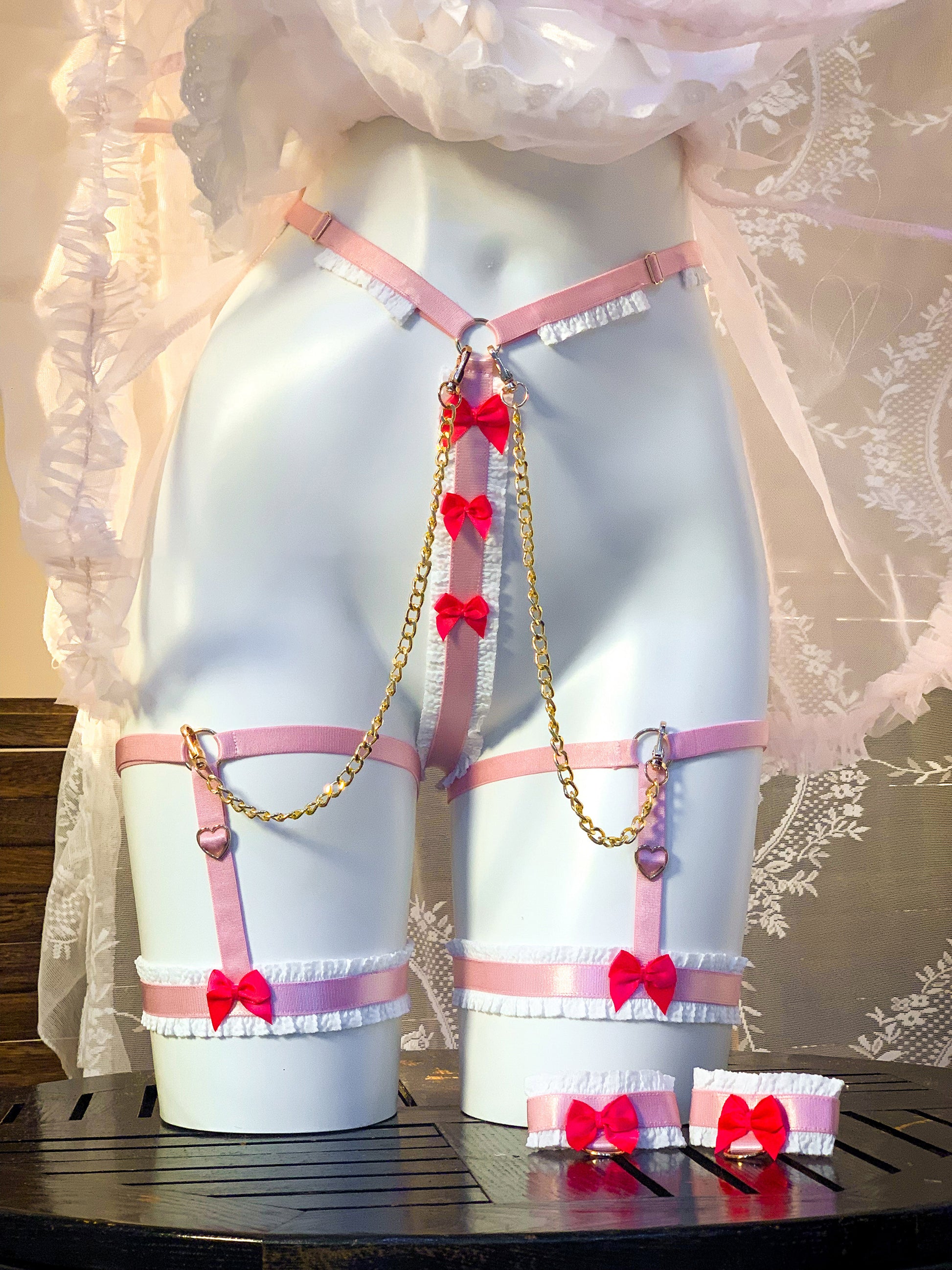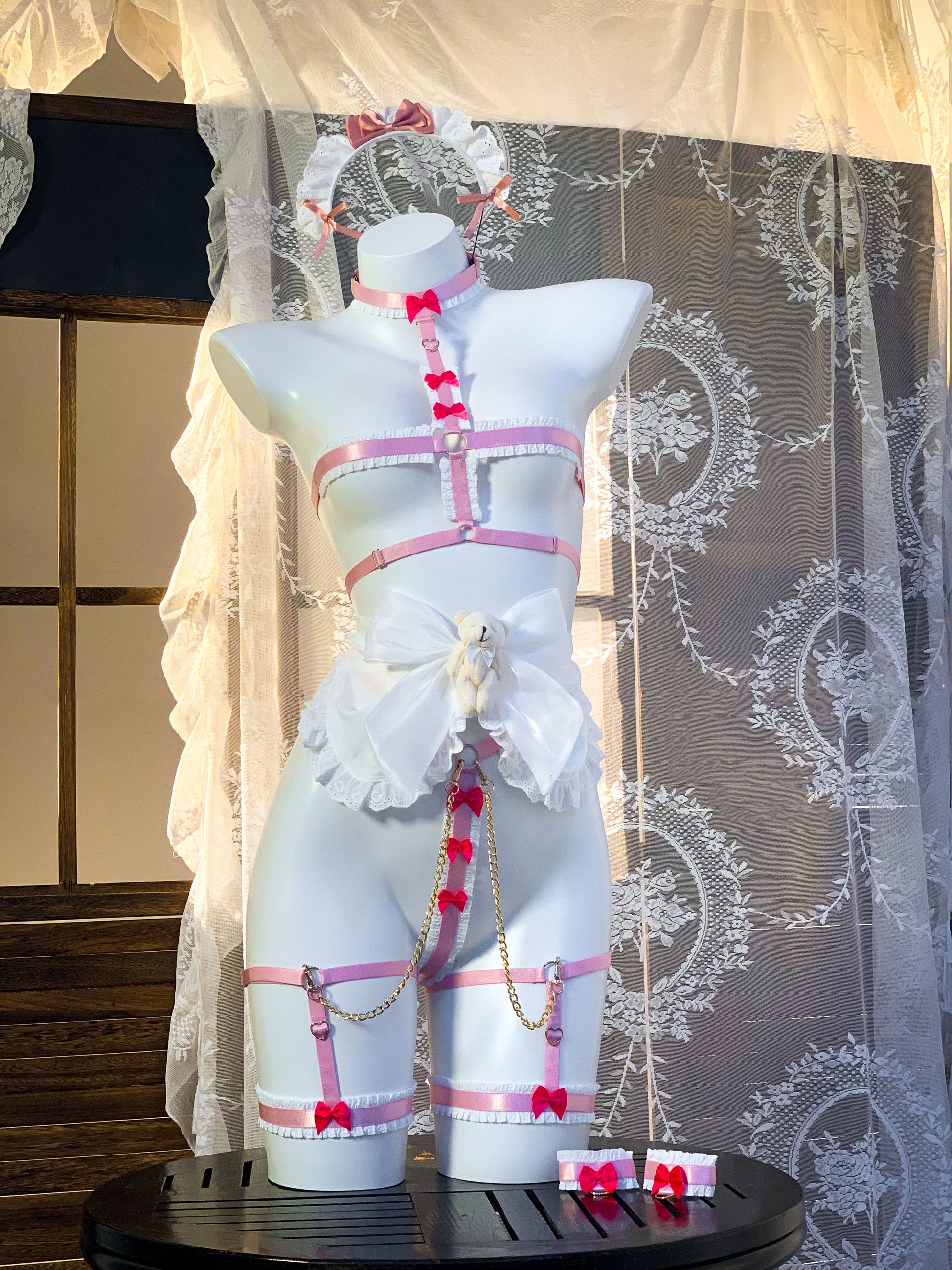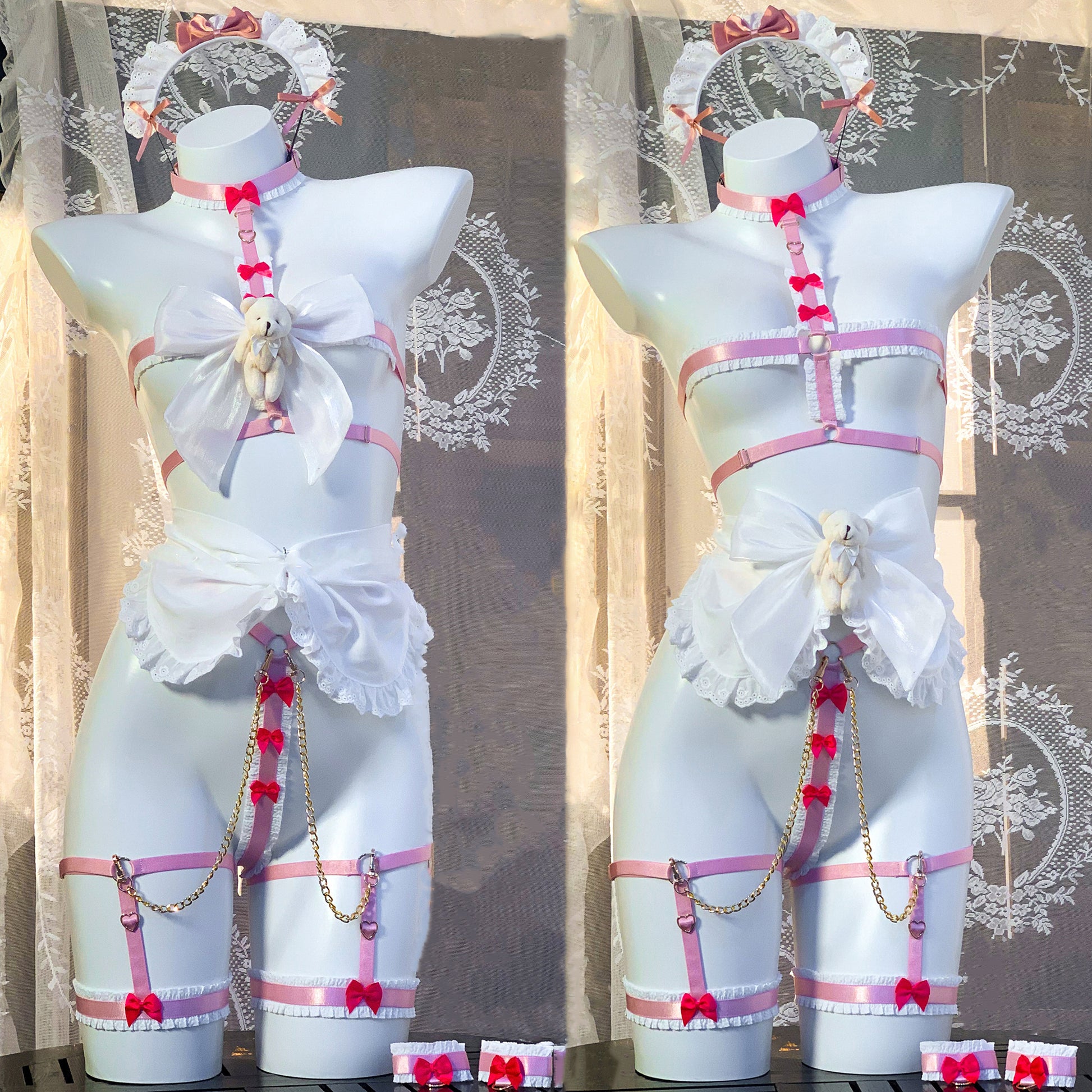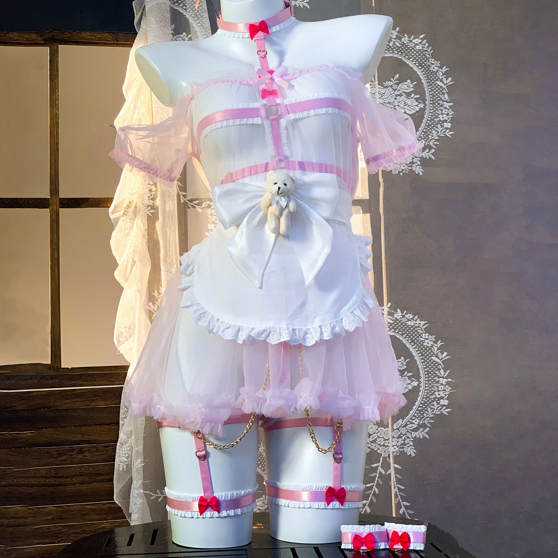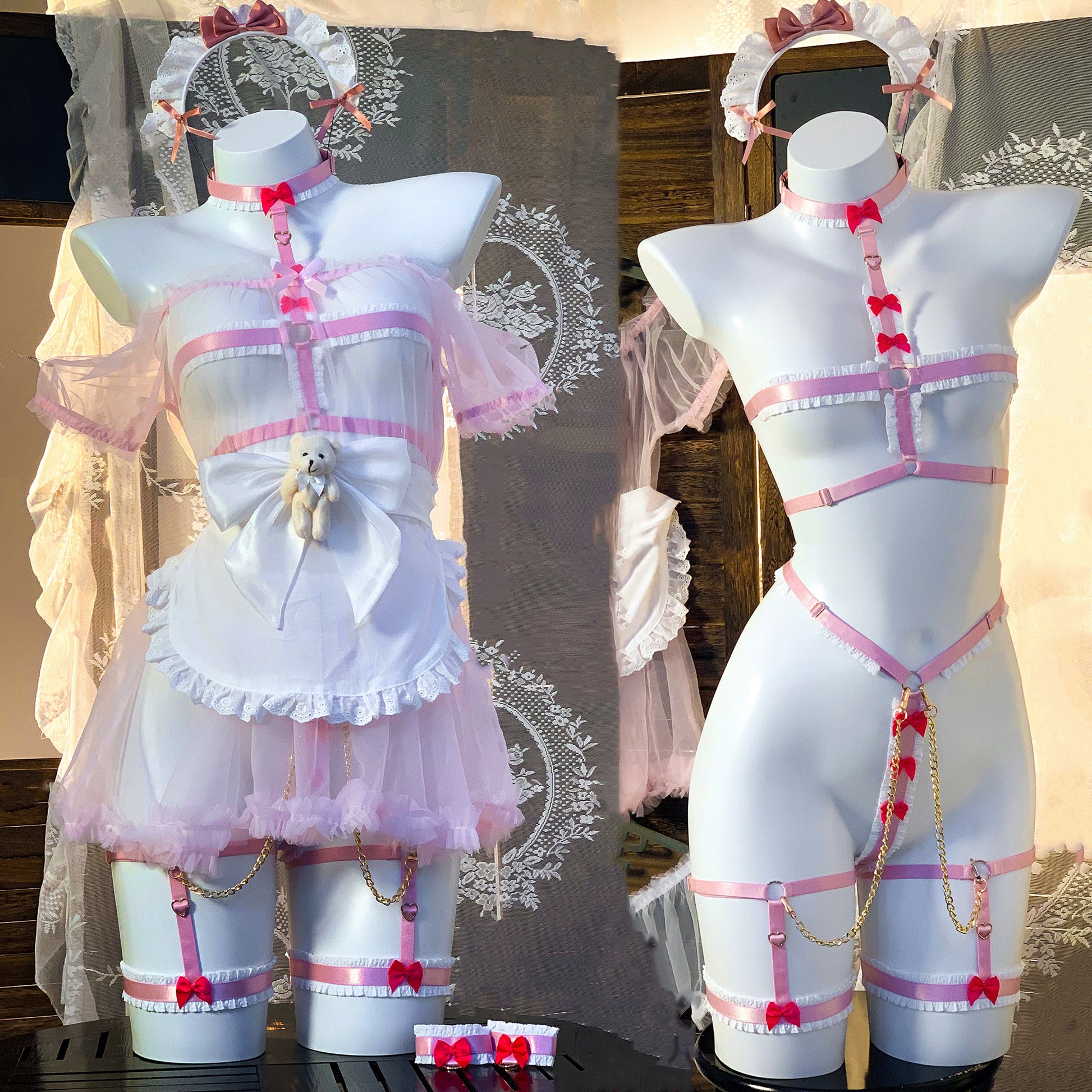 【商品内容】ハーネス、ワンピース、カチューシャ、腕輪*2、太もも輪*2、クマ付きのリボン、エプロン、メタルチェーン*2、ストッキング*2