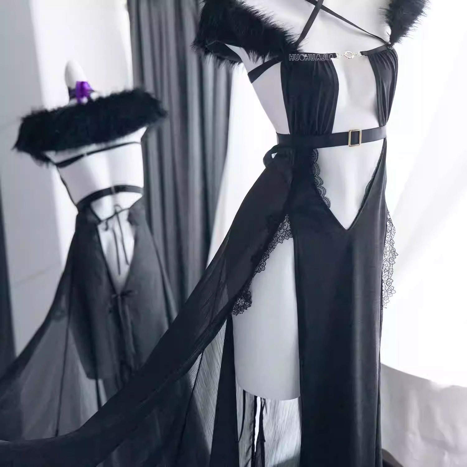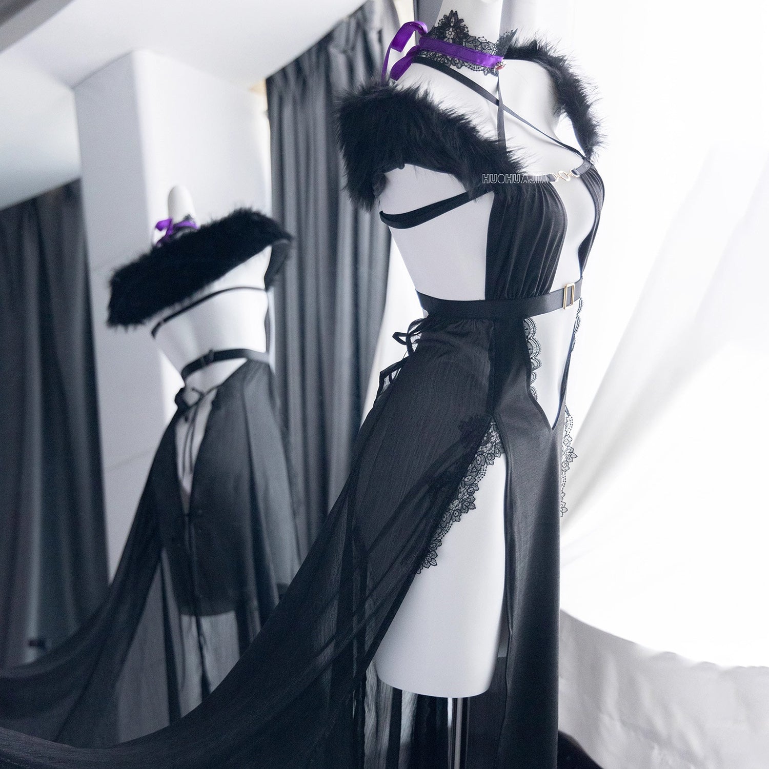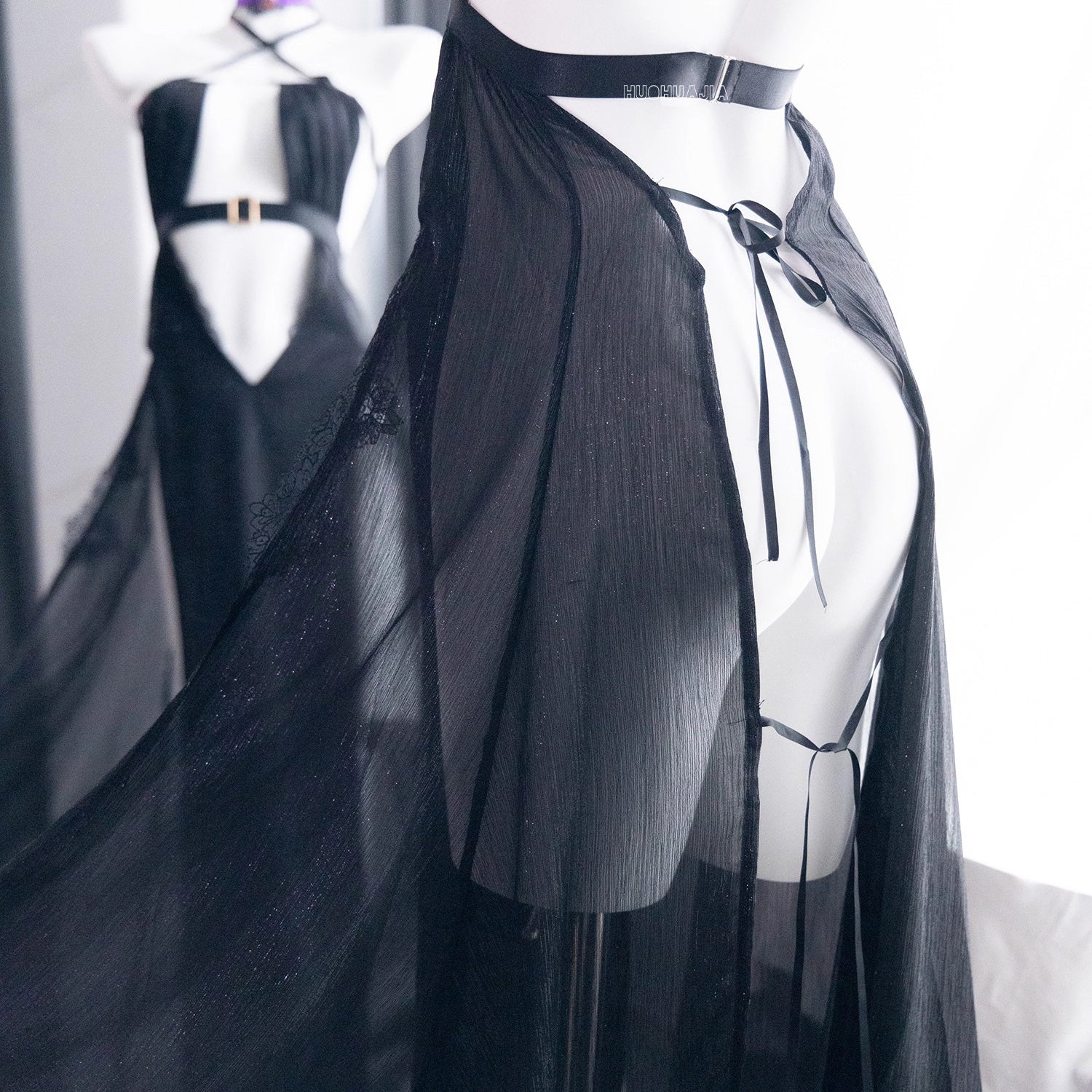 高貴で危険な香りを放つ、闇夜に咲く黒のセクシー魔女のドレスです。胸元を強調するクロスストラップ、腰のスリットから覗く素肌…。