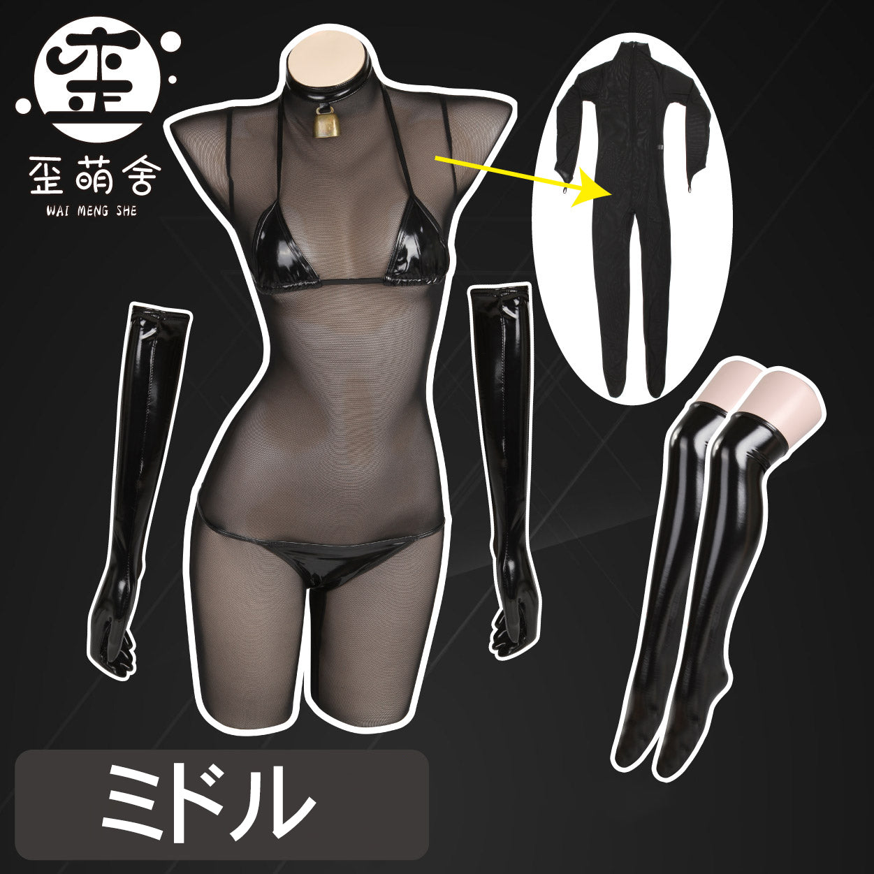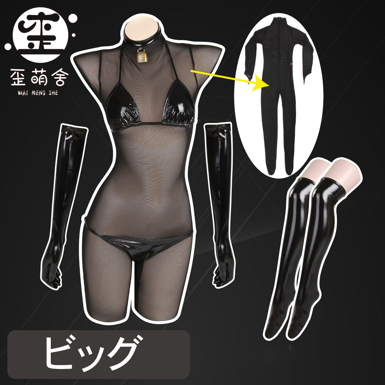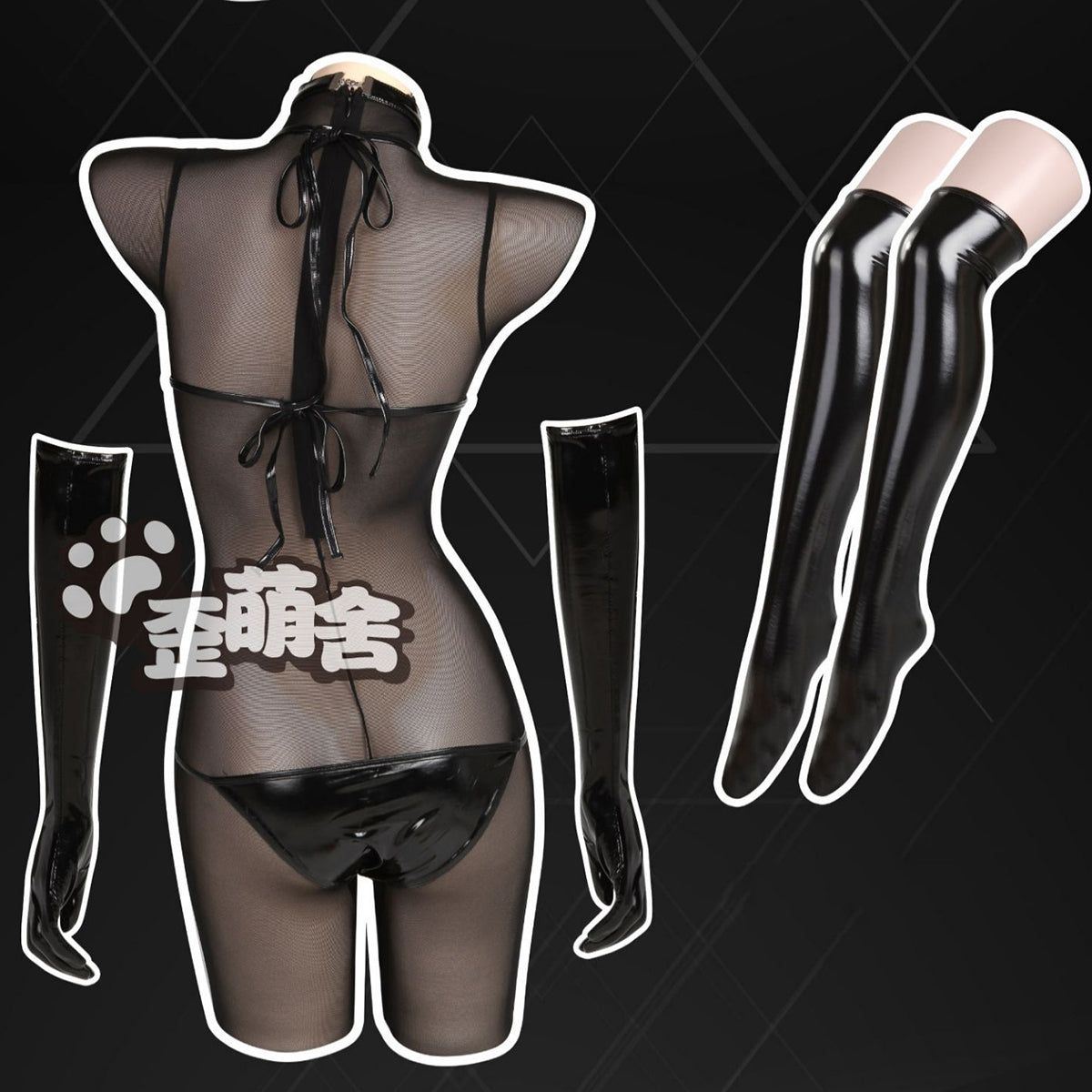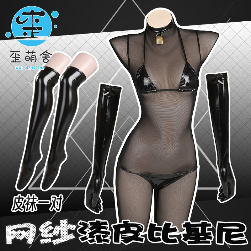 透け透けメッシュボディスーツとエナメルビキニコスプレ5点セット【歪萌舍】