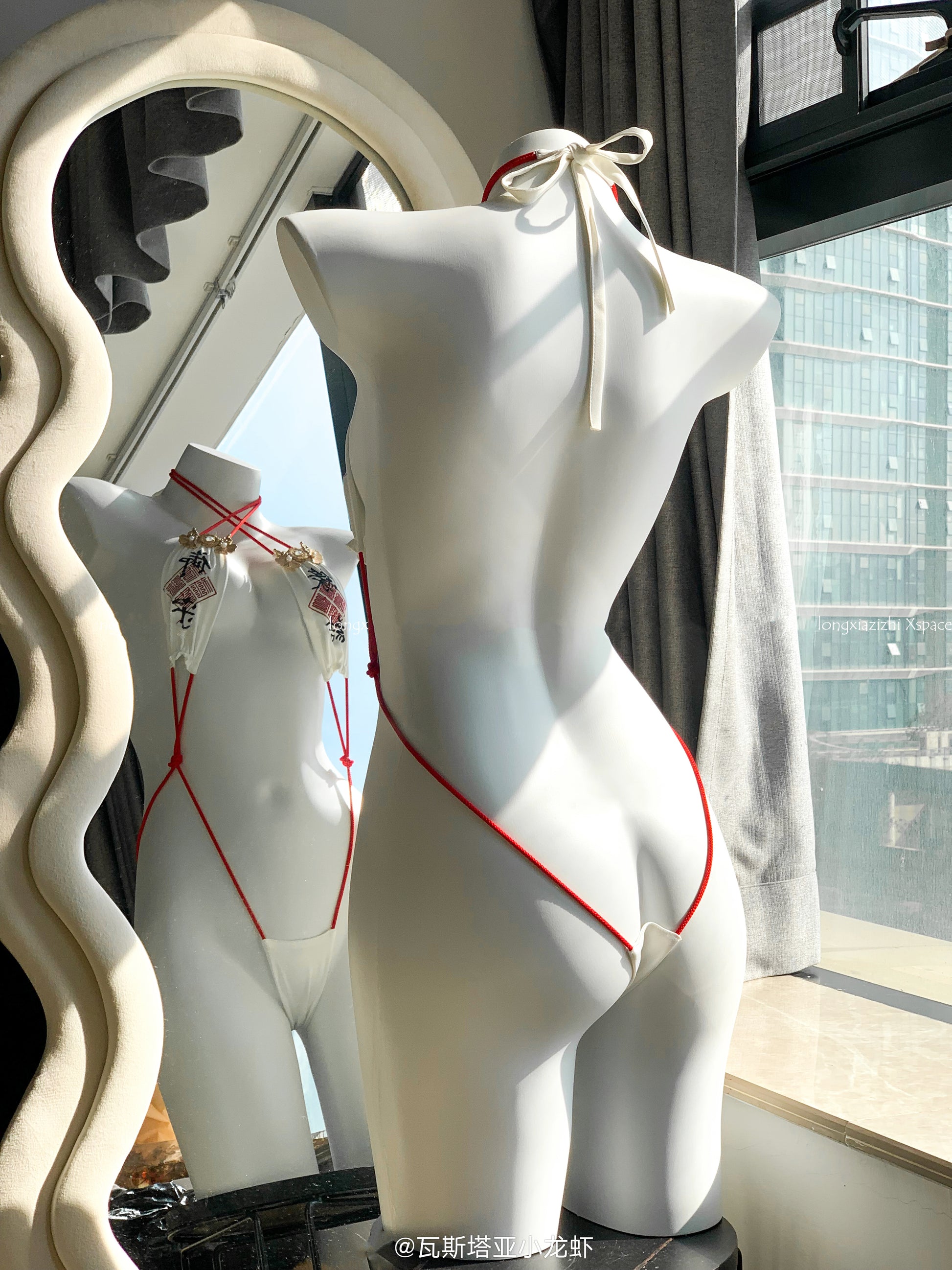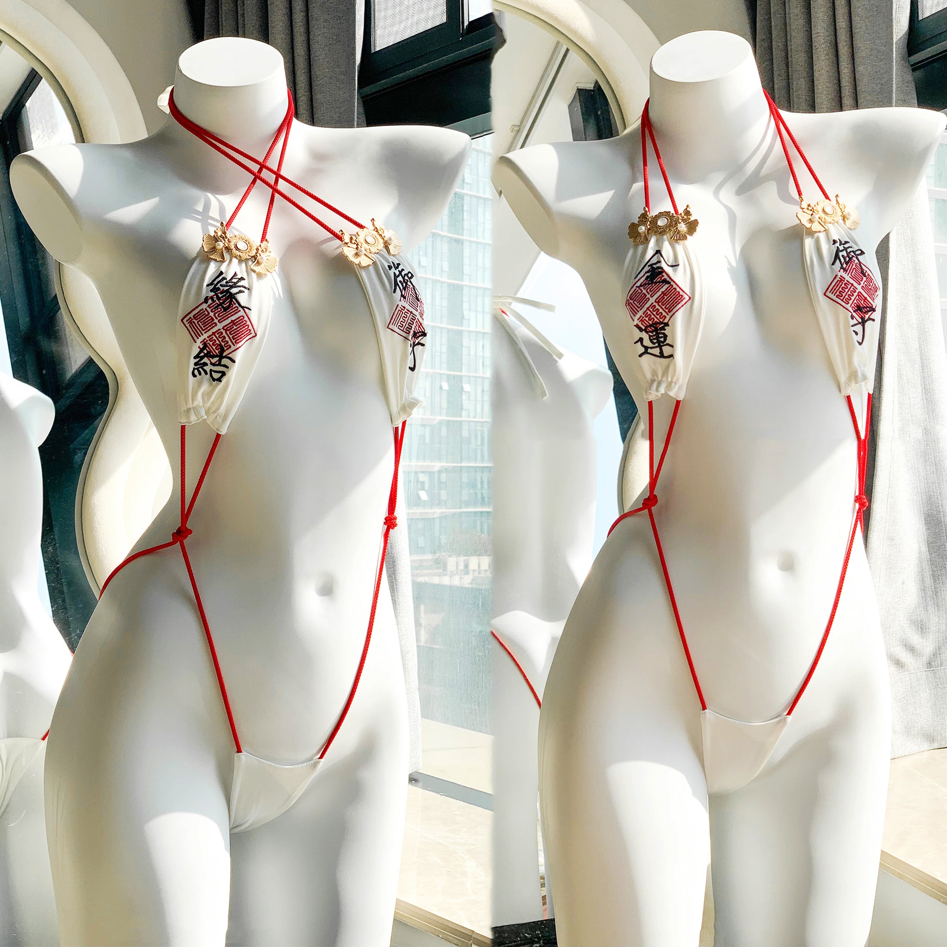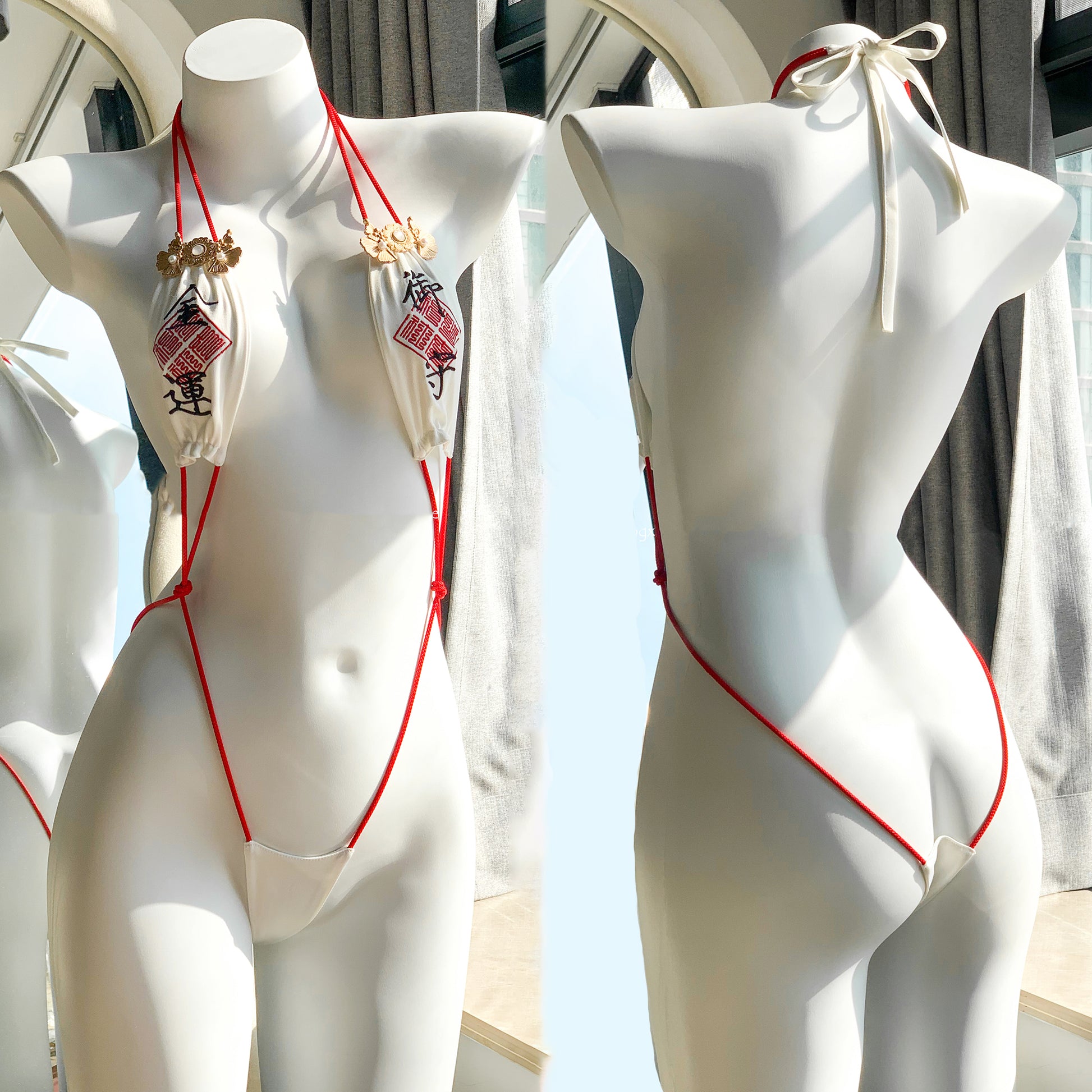 赤と白の色合いが伝統的な巫女の雰囲気を引き立て、マイクロビキニの大胆なデザインで身体を究極にセクシーに彩りましょう♪